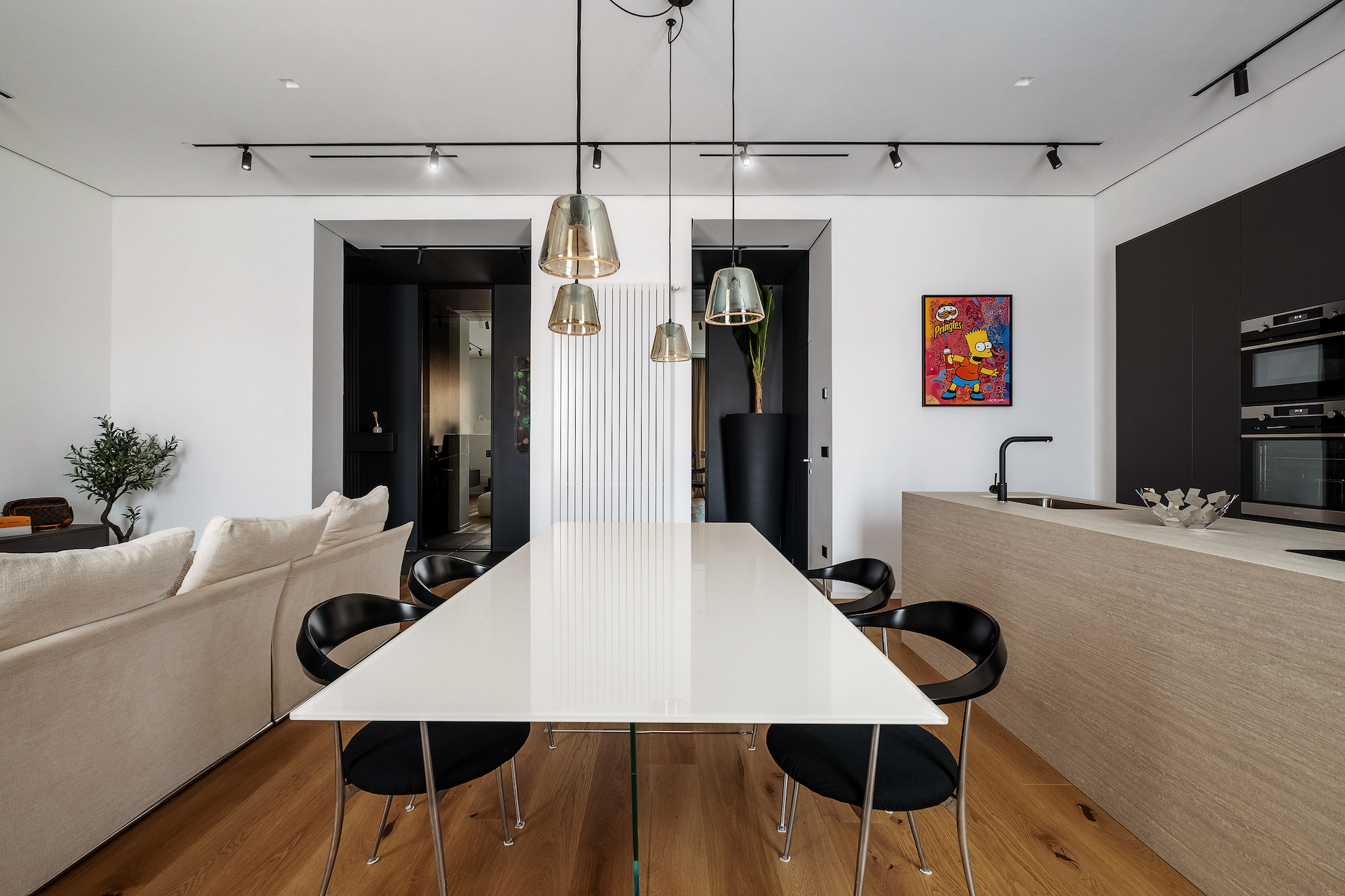 The dining area’s glossy white table on glass legs reflects light, amplifying the sense of lightness. Meanwhile, the black chairs with their enveloping lines create a graphic counterpoint, echoing the black-and-white theme — the aesthetic signature of the entire project.