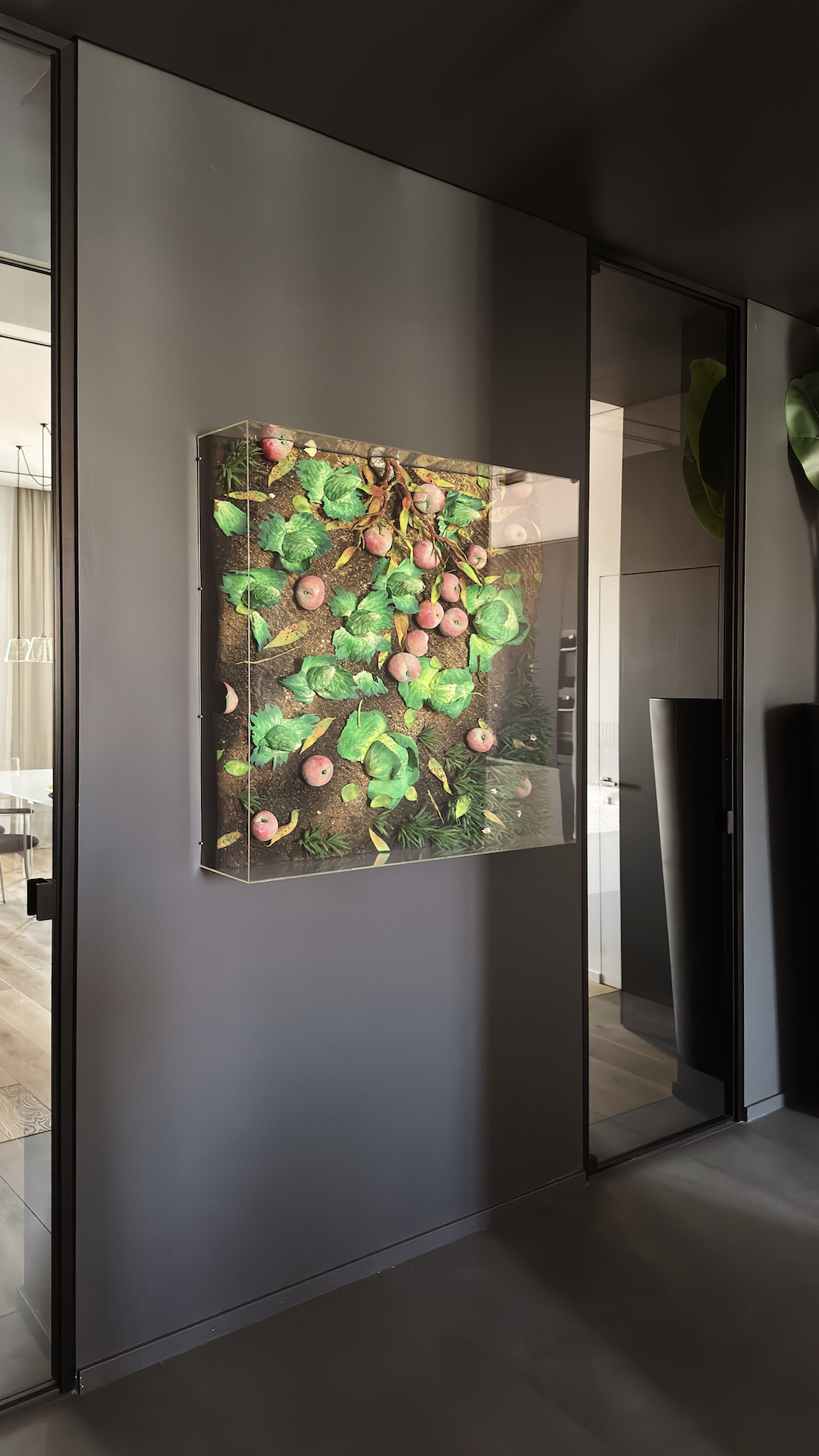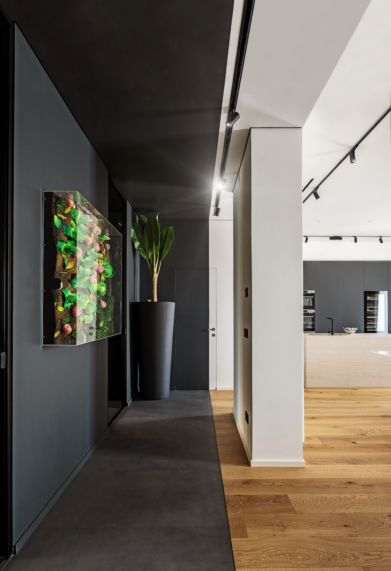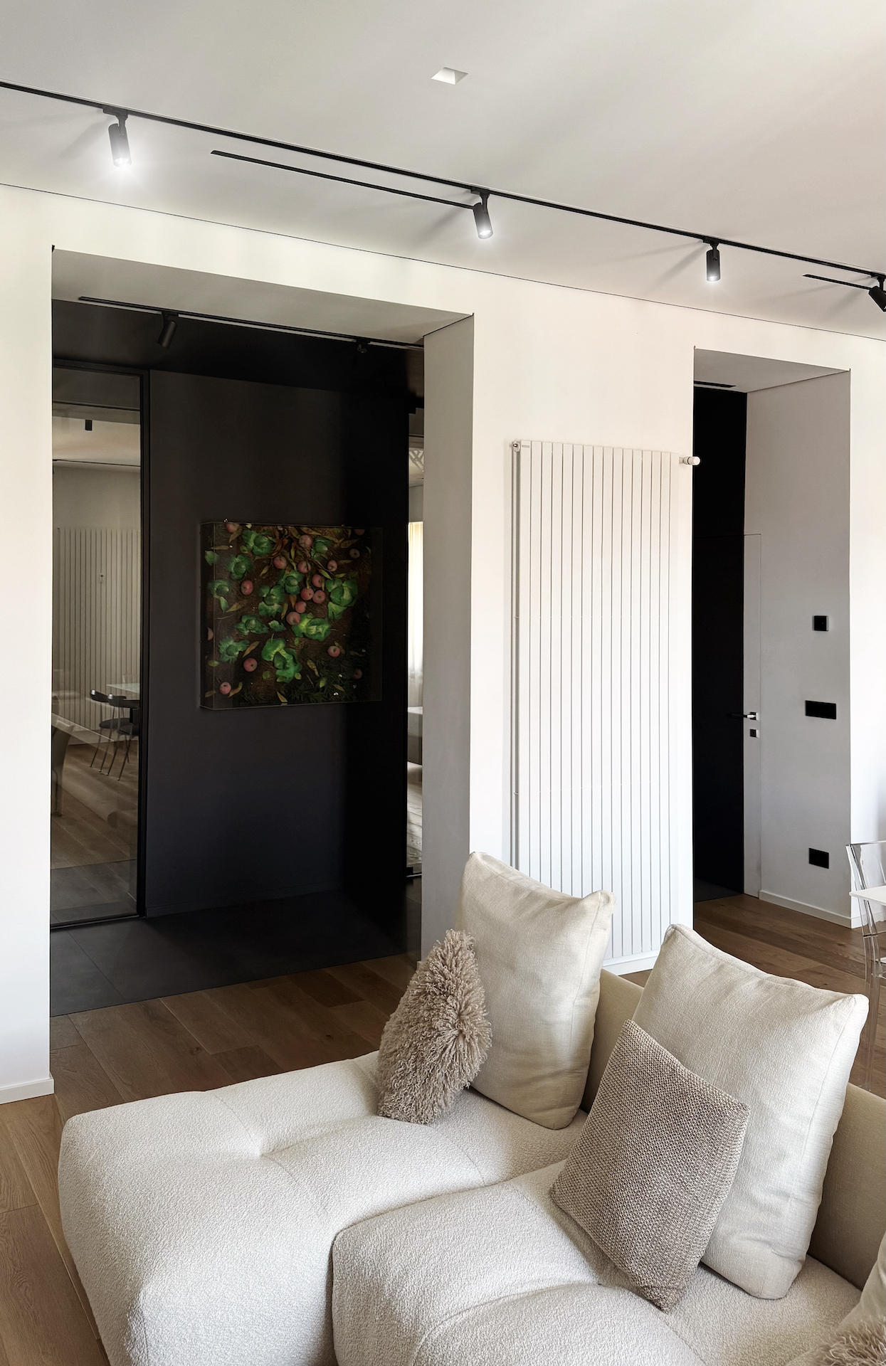 The main theme of the project, chromatic dualism, takes shape here. Black and white, light and shadow, and ancient and modern elements are intertwined in dynamic balance, dividing the apartment into two distinct areas with different functions. The bright, airy living area reflects the energy of daytime activities, while the darker, more intimate sleeping area evokes contemplation and tranquillity. These two spaces are in constant dialogue: the light of action and the shadow of contemplation.