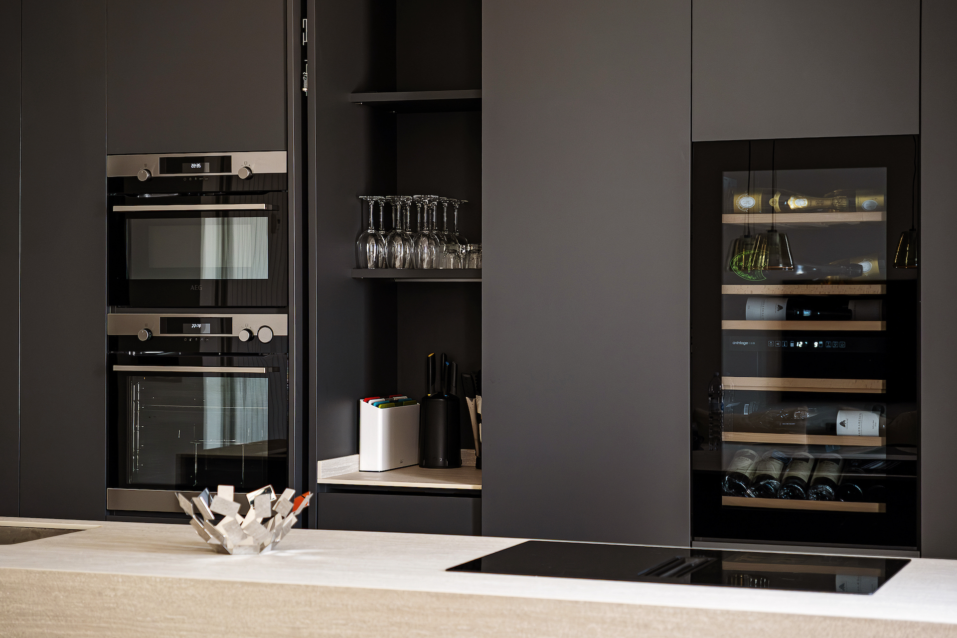 The living area opens up into a large, fluid space that combines the living room, dining area and kitchen to create an orderly and scenic composition. The kitchen, which features a natural travertine island custom-made by local craftsmen, is the visual and functional centrepiece of the space. The monolithic volume of the island interacts with the anthracite grey wall behind it, which features single-panel columns marked by clean, continuous lines. Above, a series of smoked glass pendant lamps creates a refined luminous backdrop, while neutral fabric curtains filter the natural light coming in through the large side windows, softening the contrast between the linearity of the surfaces and the warmth of the floor.