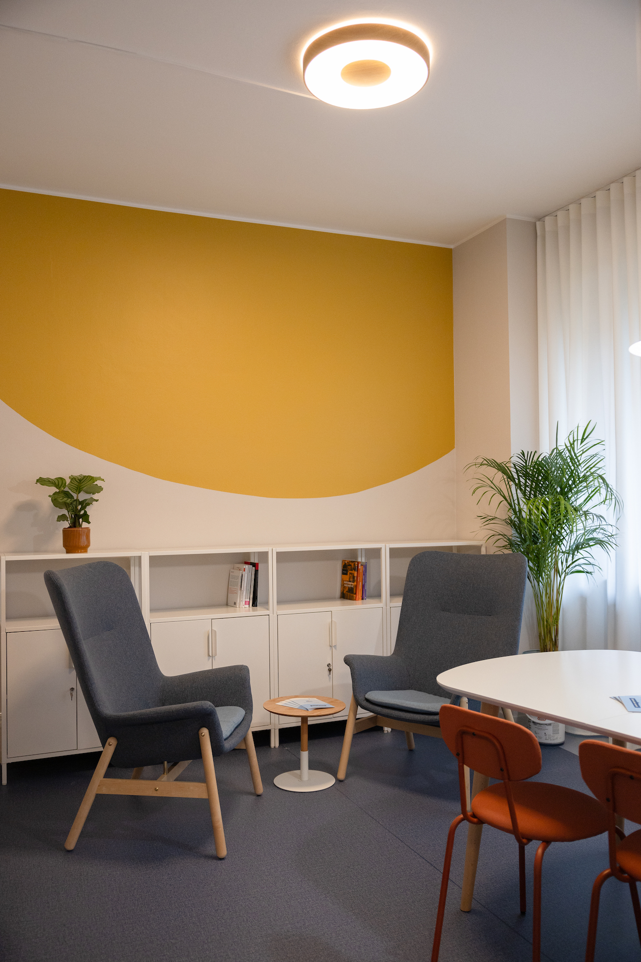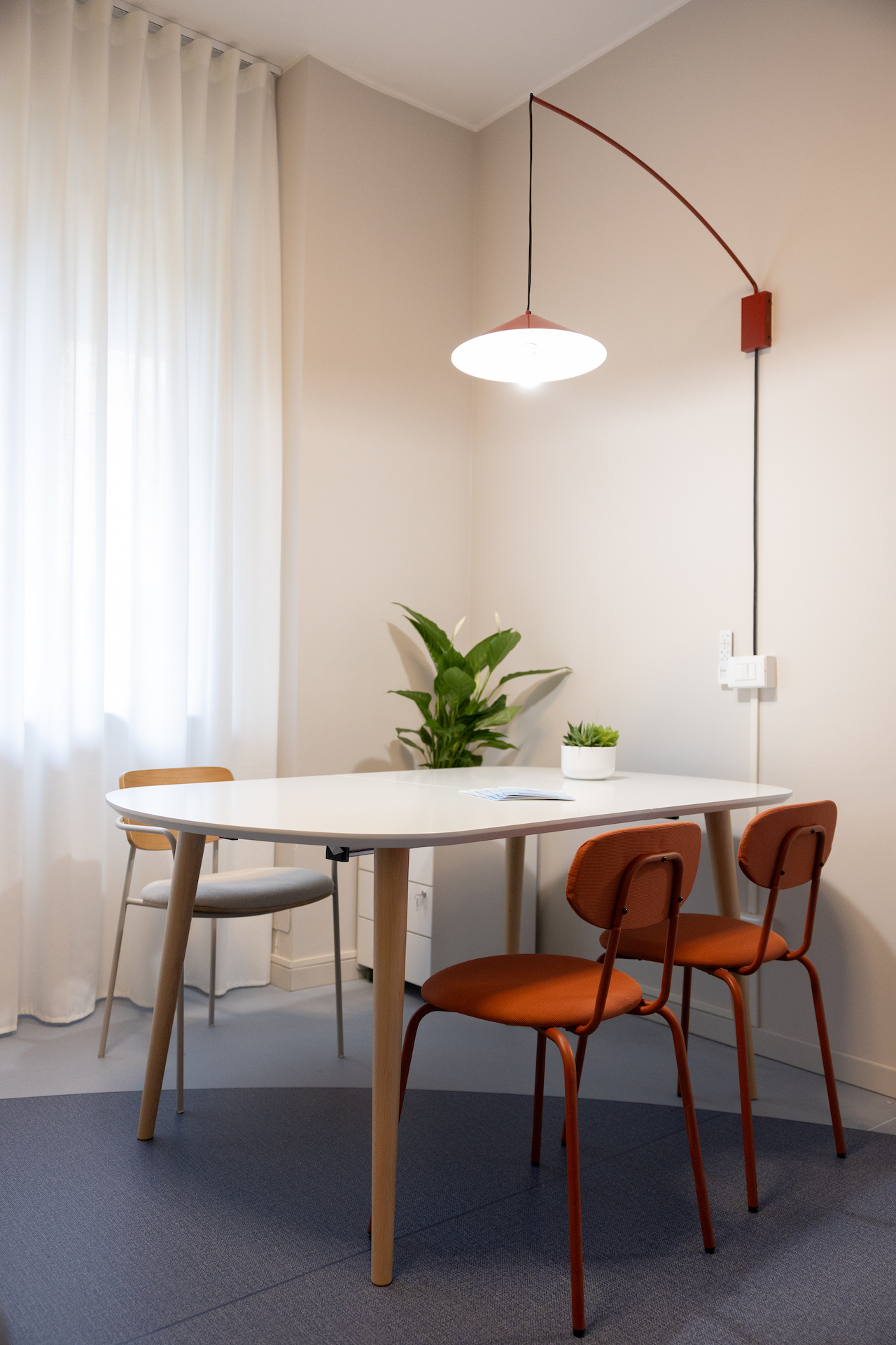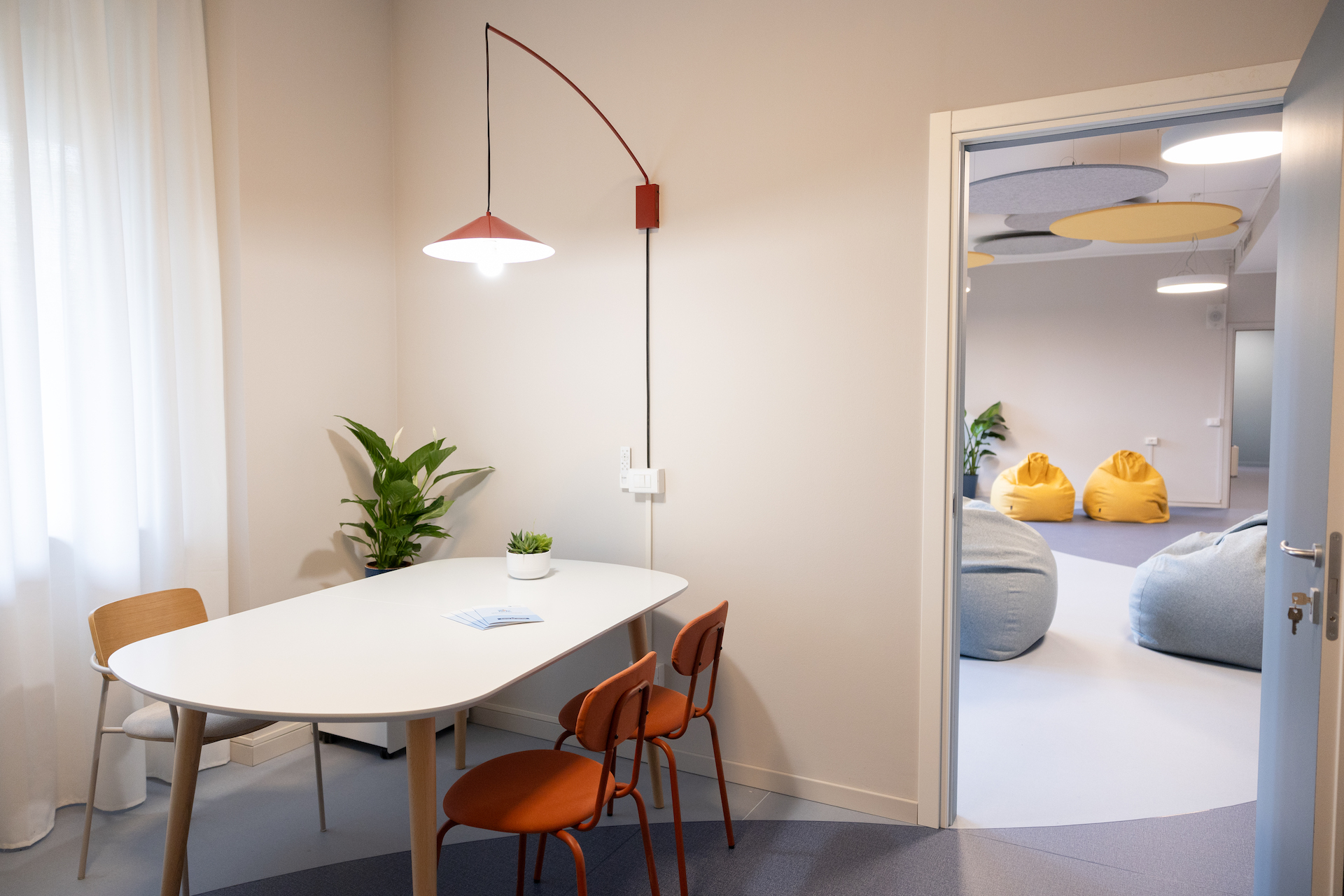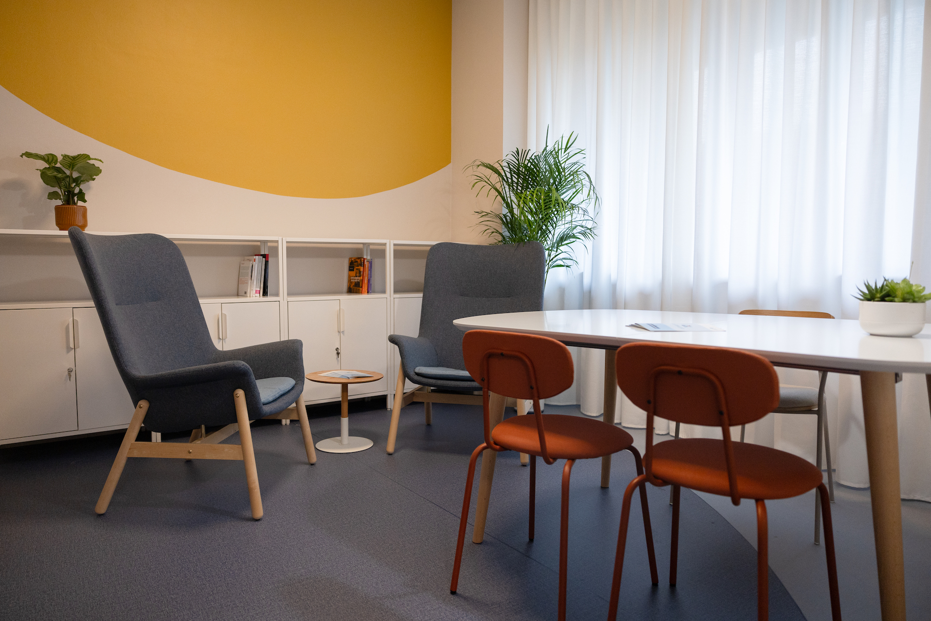In addition to the large open space, the Re.Te Center has two private rooms designed for confidential meetings. These rooms resemble small rooms in a home. Comfortable armchairs with high backrests offer a sense of security and privacy, and an oval table encourages discussion and interaction.