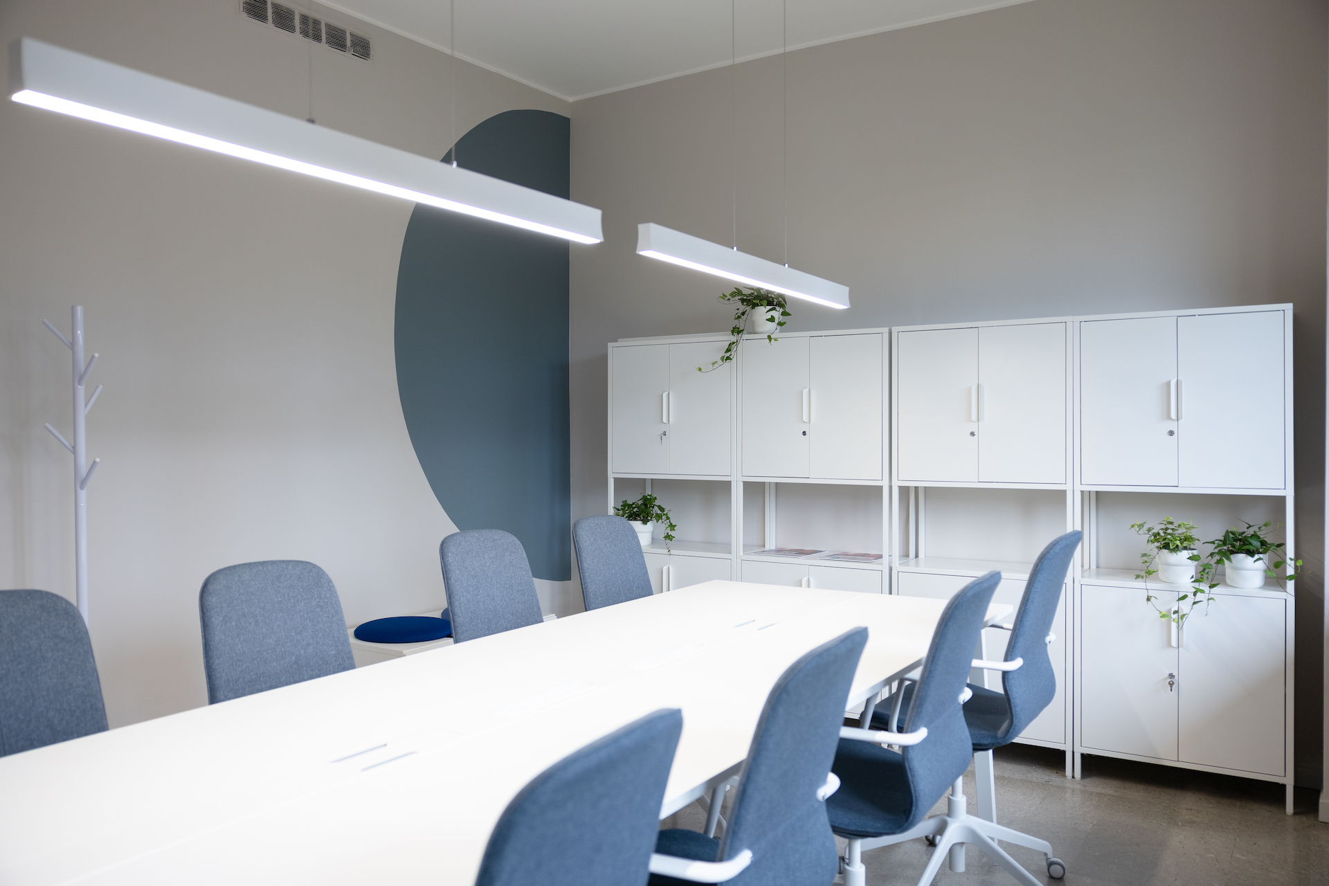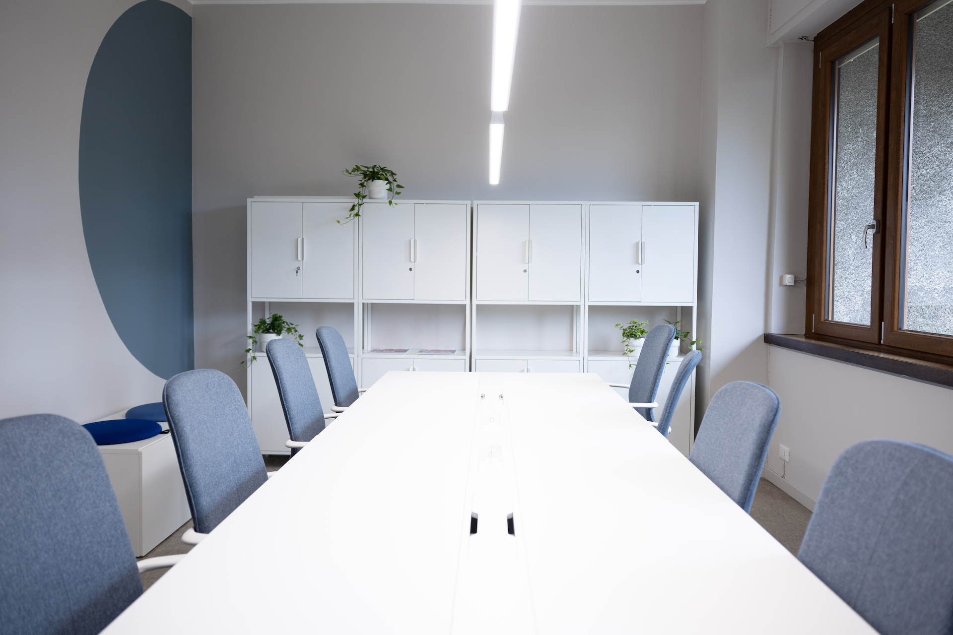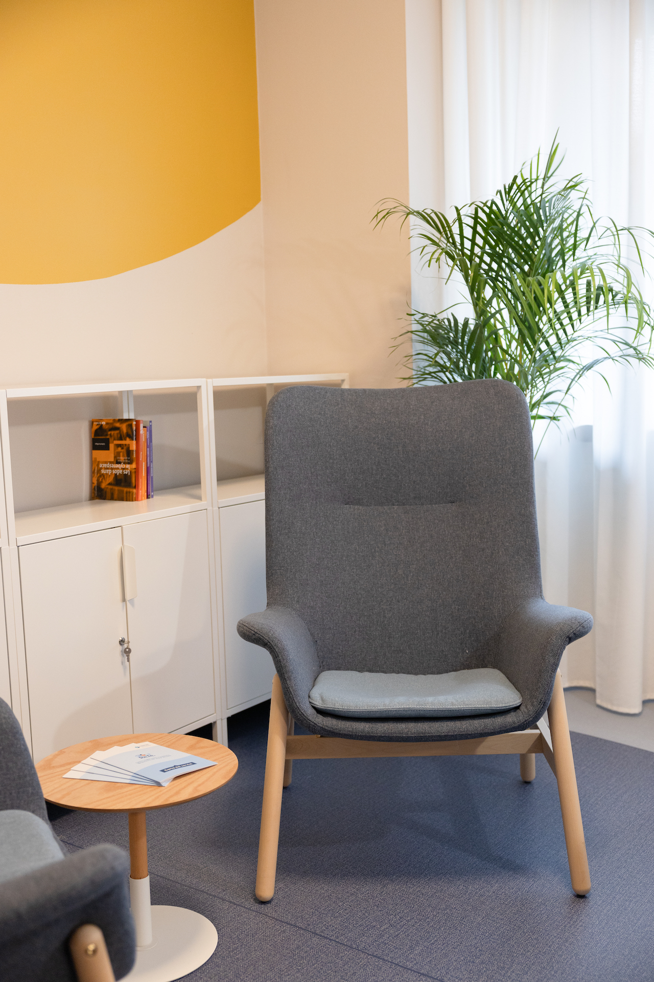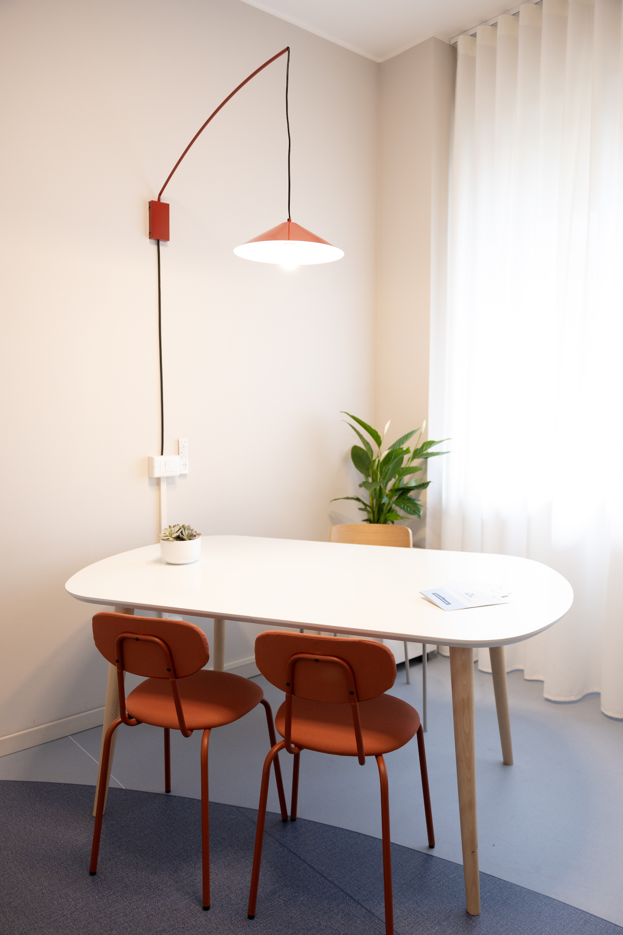 In addition to the large open space, the Re.Te Center has two private rooms designed for confidential meetings. These rooms resemble small rooms in a home. Comfortable armchairs with high backrests offer a sense of security and privacy, and an oval table encourages discussion and interaction.