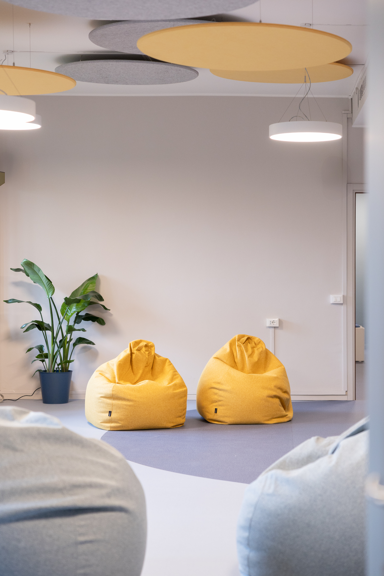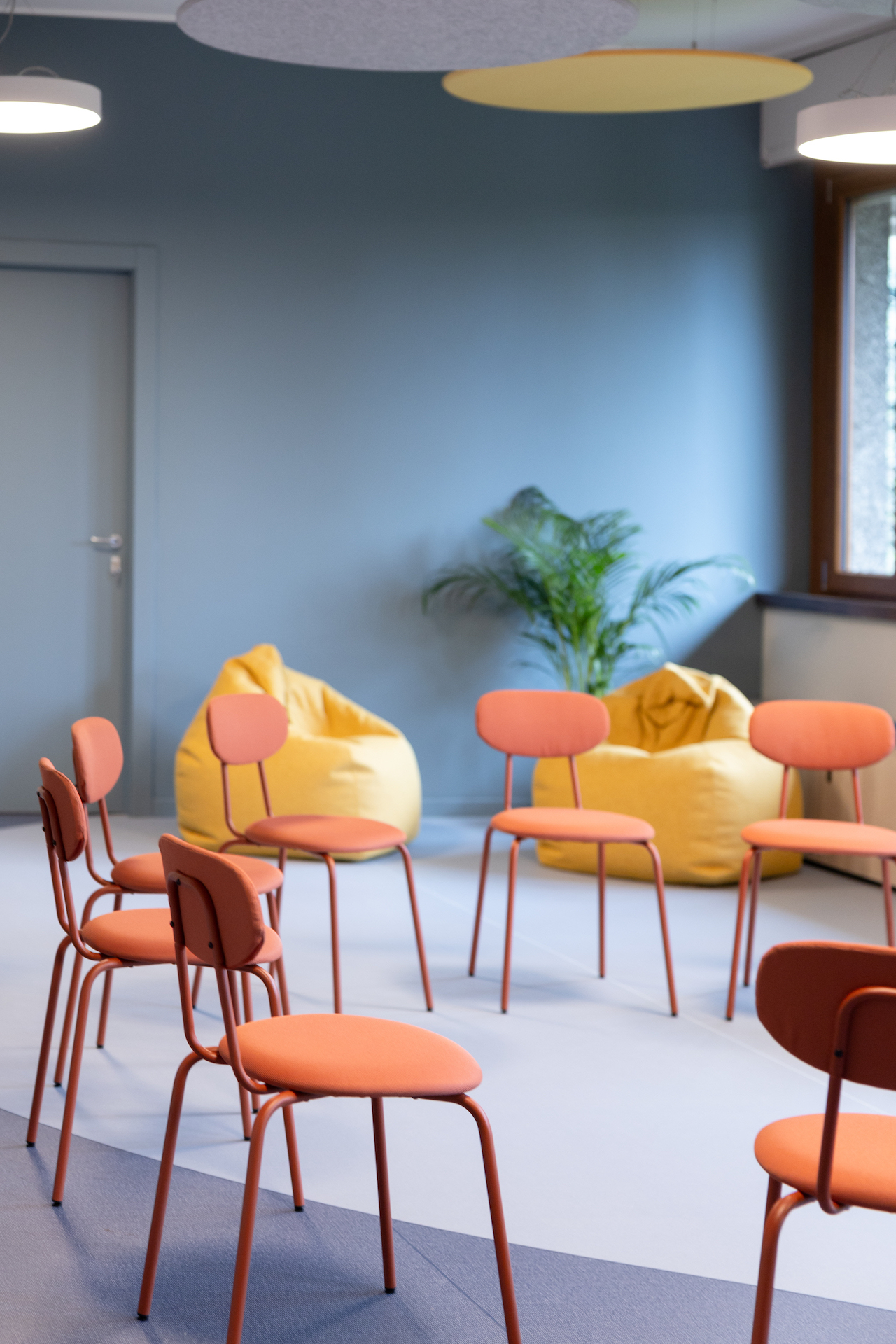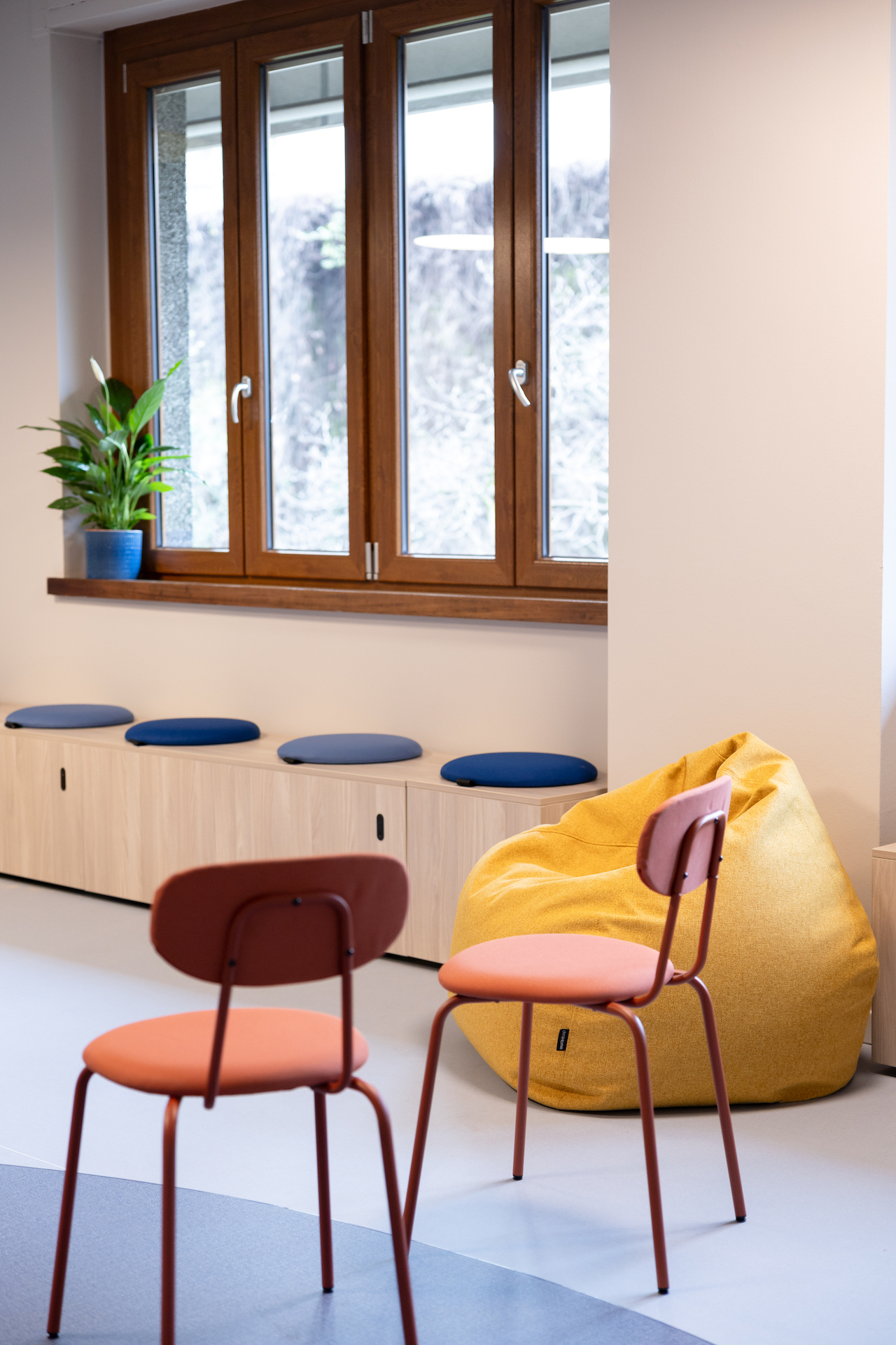 The furnishings stimulate various modes of interaction. There are chairs for formal discussions and soft, enveloping beanbag chairs that encourage relaxation. This choice reflects the desire to create an environment where one can let go with confidence, knowing that they will be heard and welcomed.