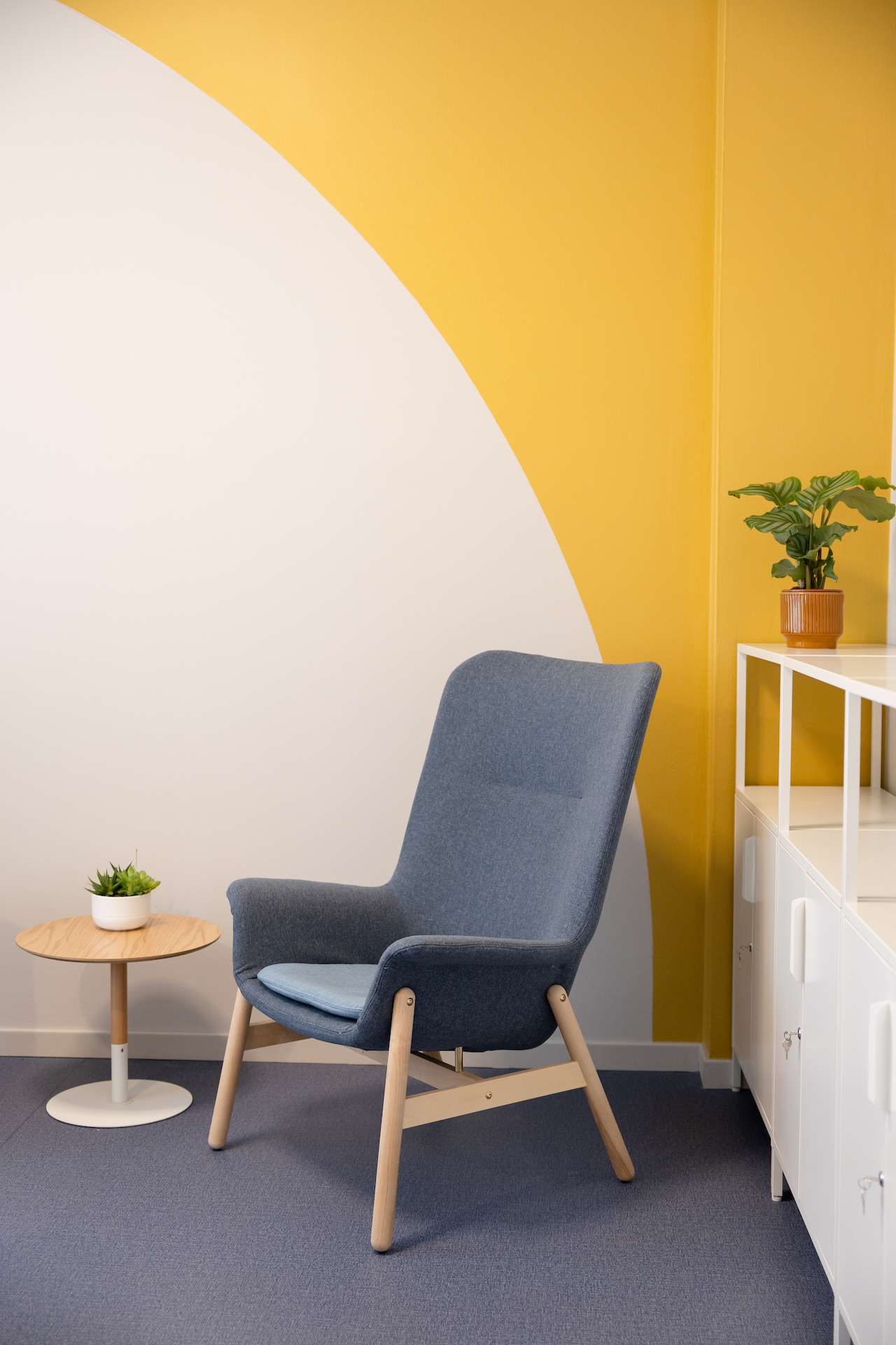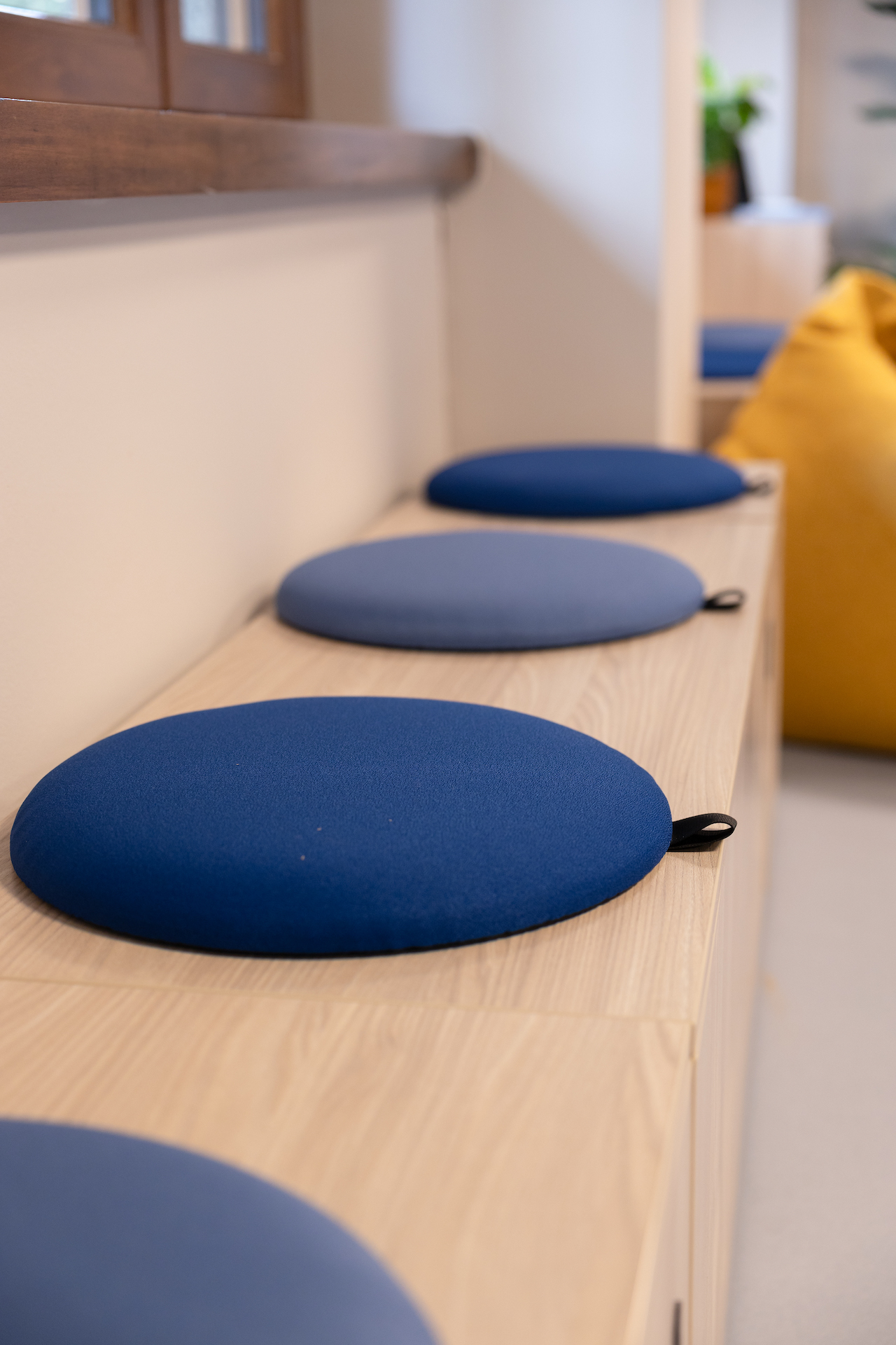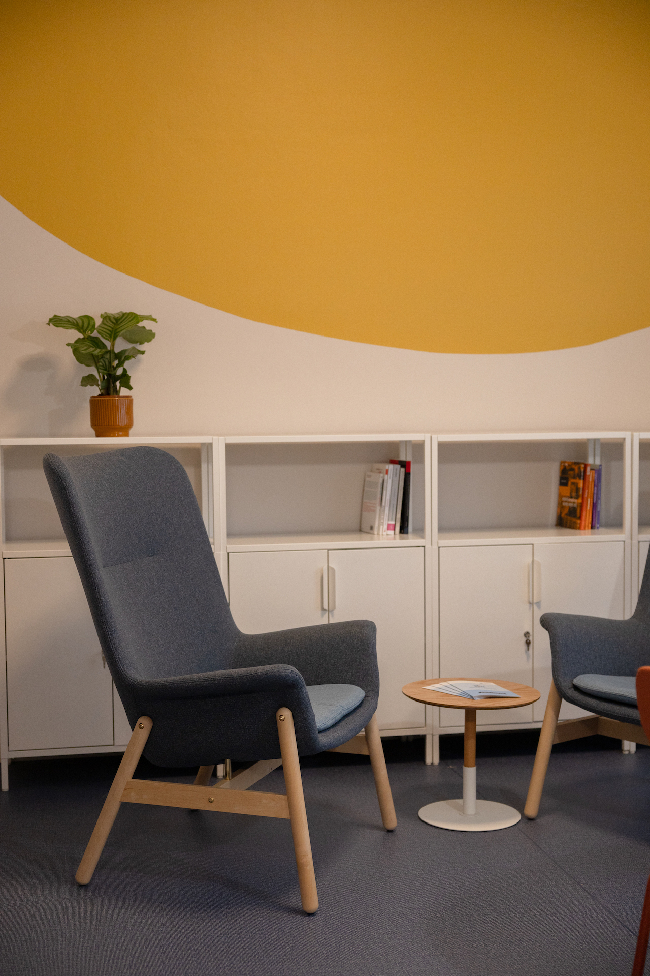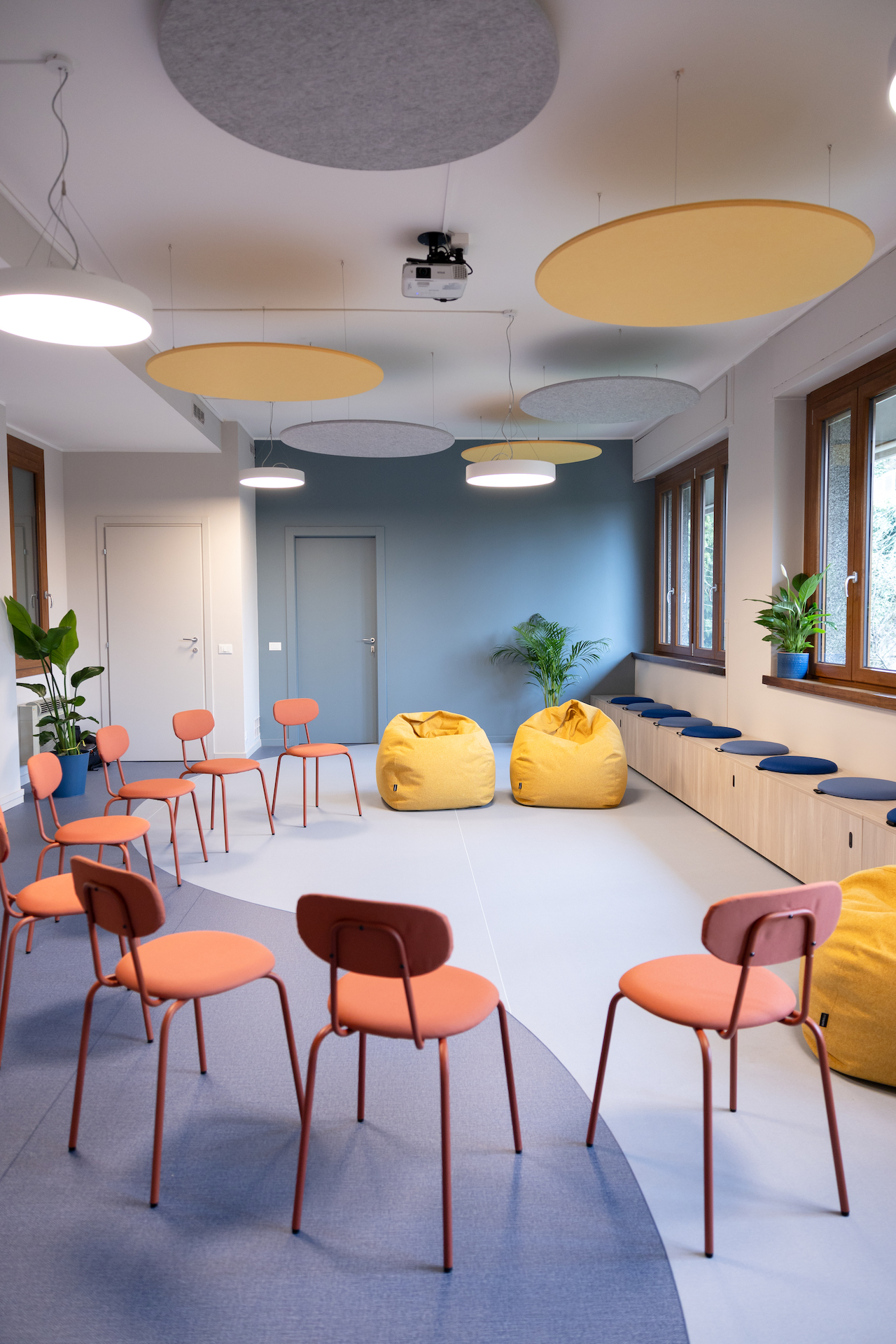 The furnishings stimulate various modes of interaction. There are chairs for formal discussions and soft, enveloping beanbag chairs that encourage relaxation. This choice reflects the desire to create an environment where one can let go with confidence, knowing that they will be heard and welcomed.