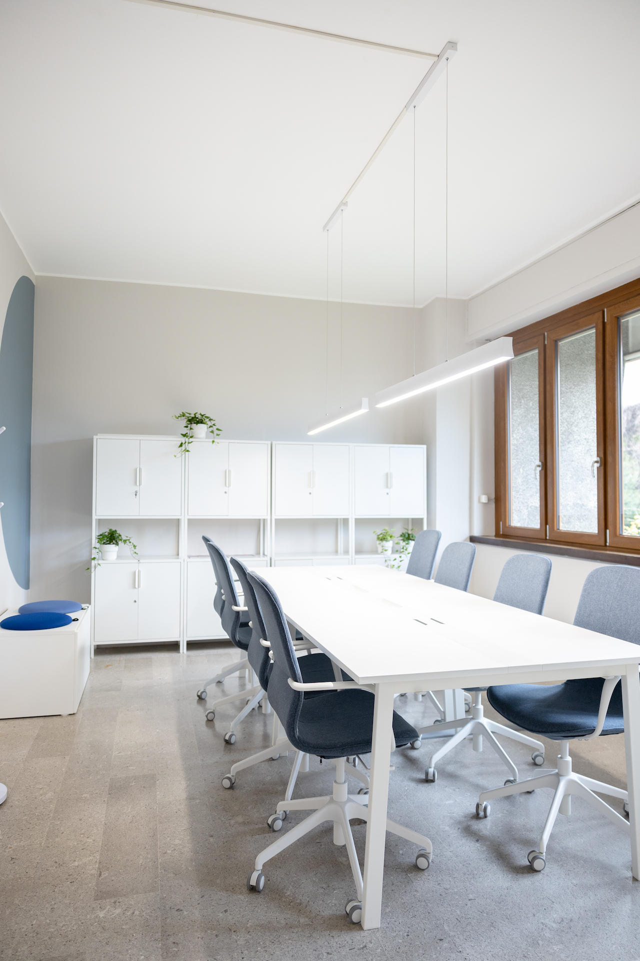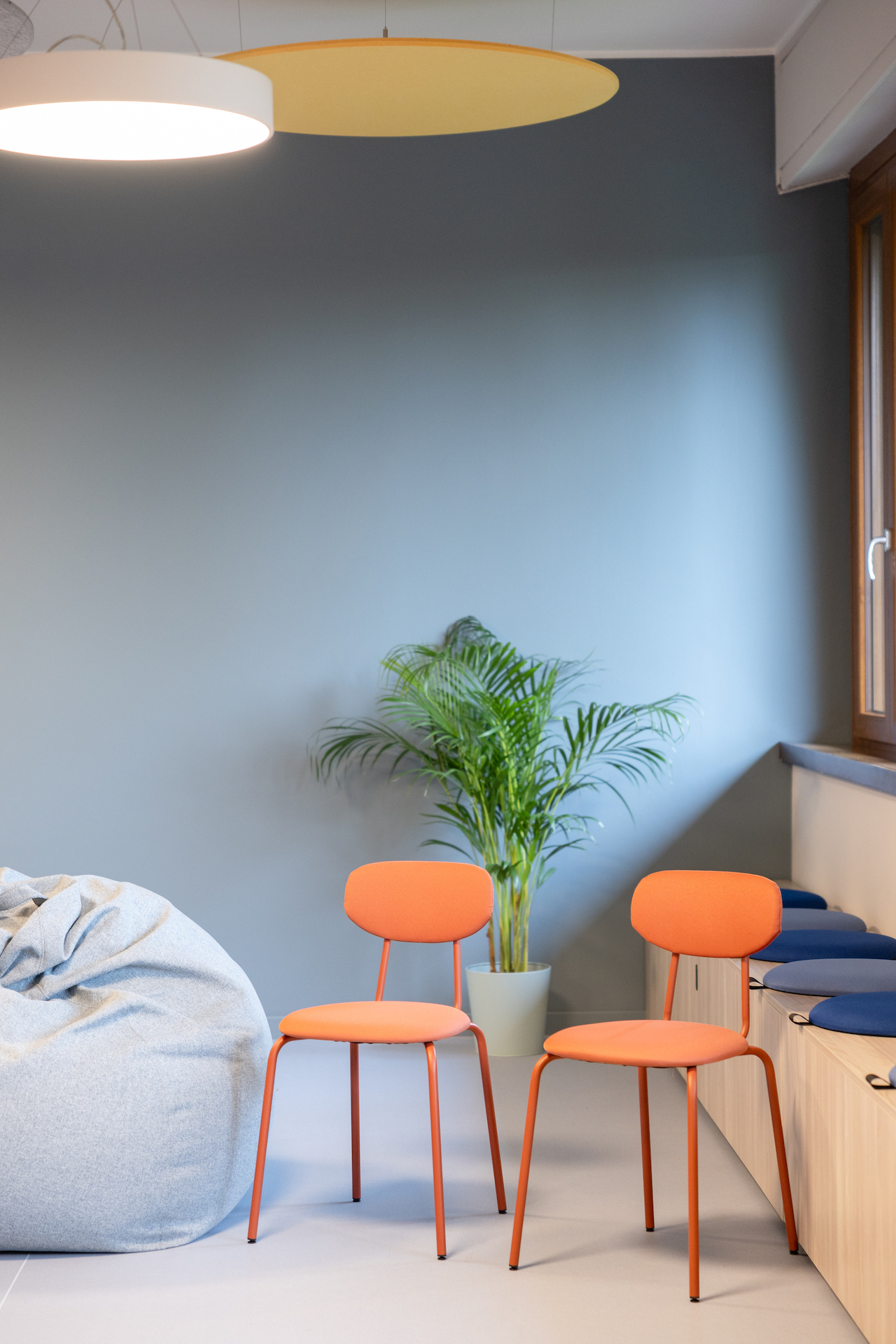 The layout is completed by tables on wheels with folding tops that can be transformed into dividing panels. These panels can be used to create sub-spaces dedicated to specific activities or for greater privacy. Wooden benches have been placed under the large windows overlooking the tree-lined courtyard to create small areas where you can relax, read, or simply look outside. In line with the principles of biophilic design, natural light and views of greenery become active elements of well-being. A view of the outside world and nature helps restore balance, concentration, and serenity.