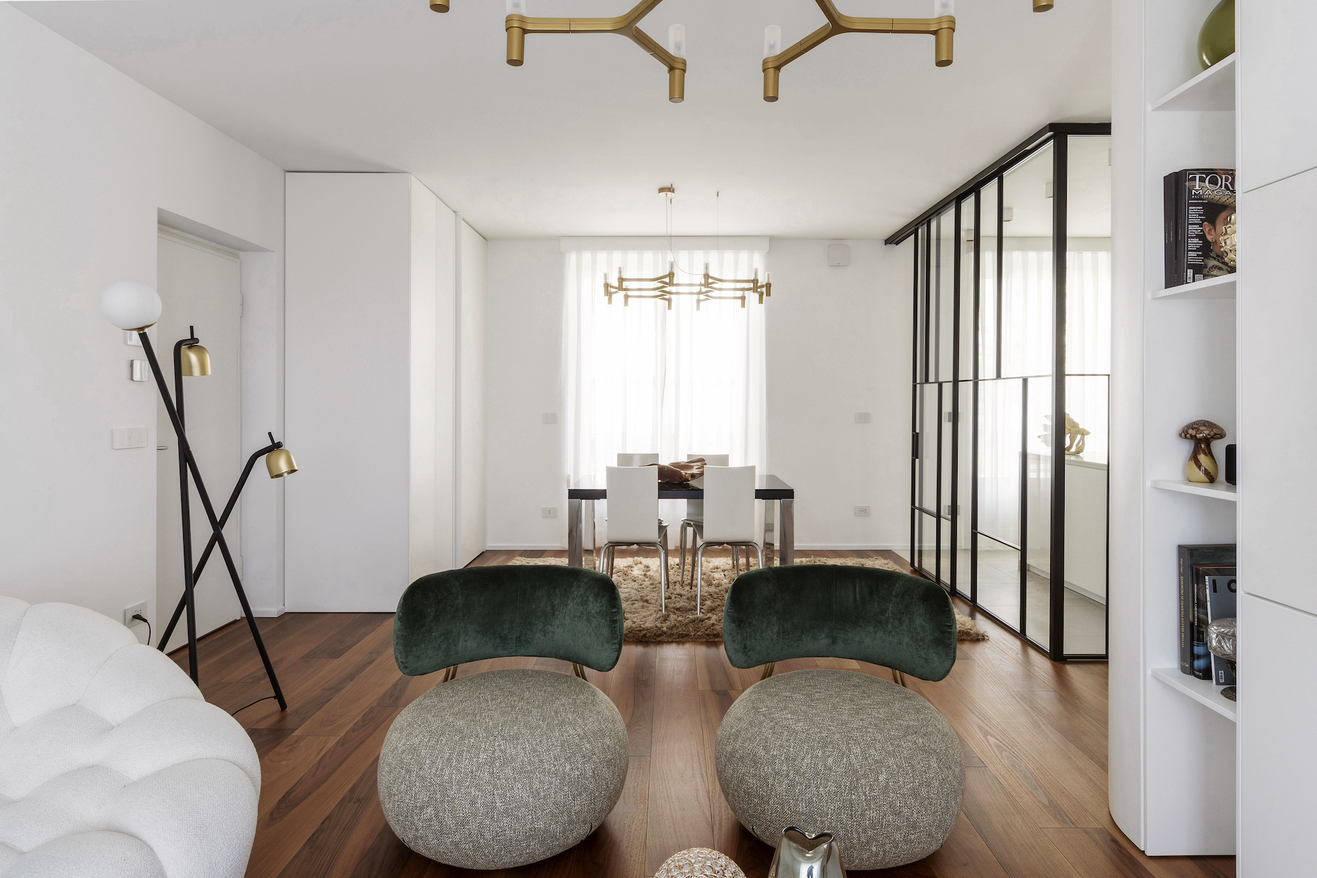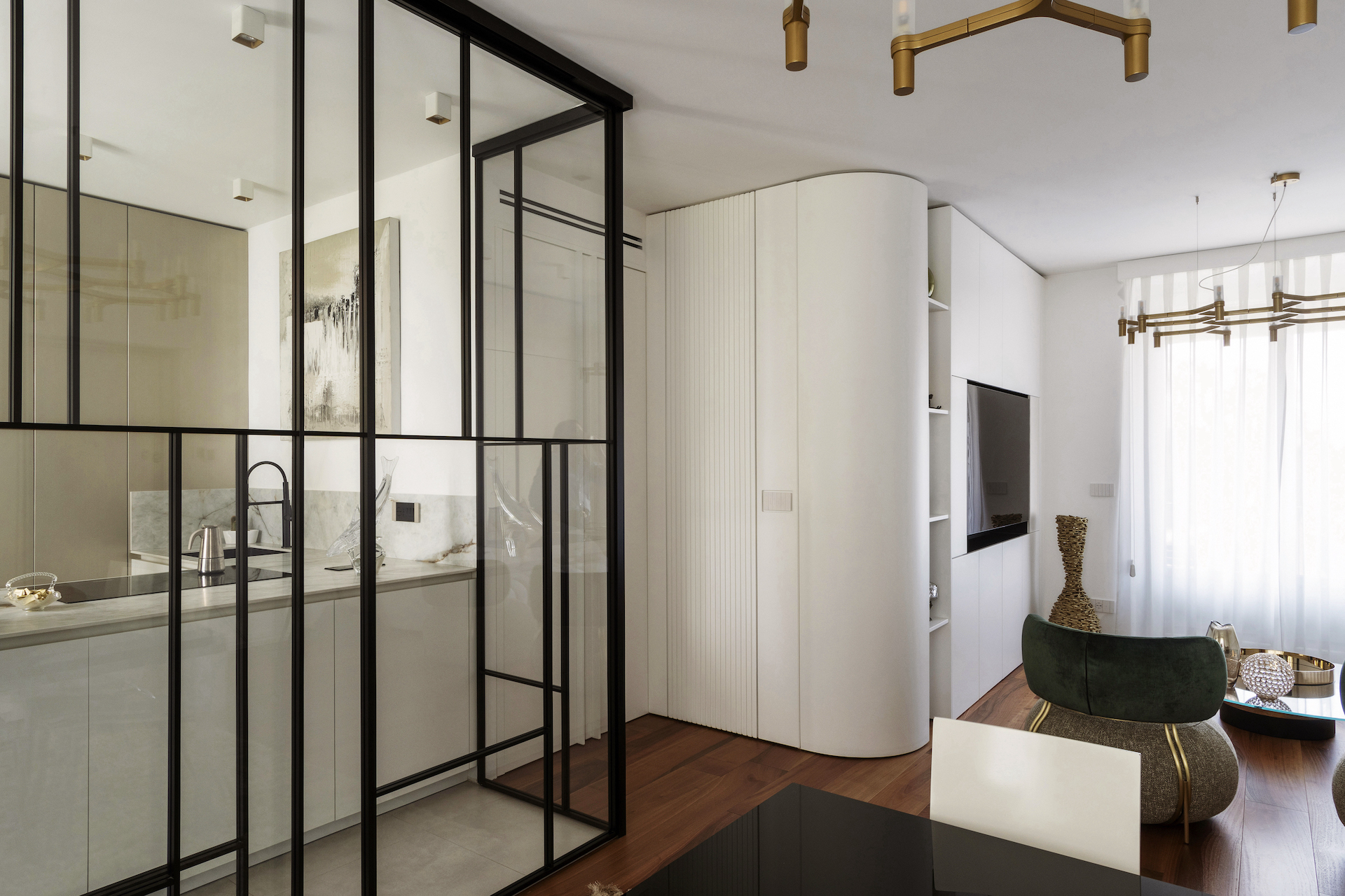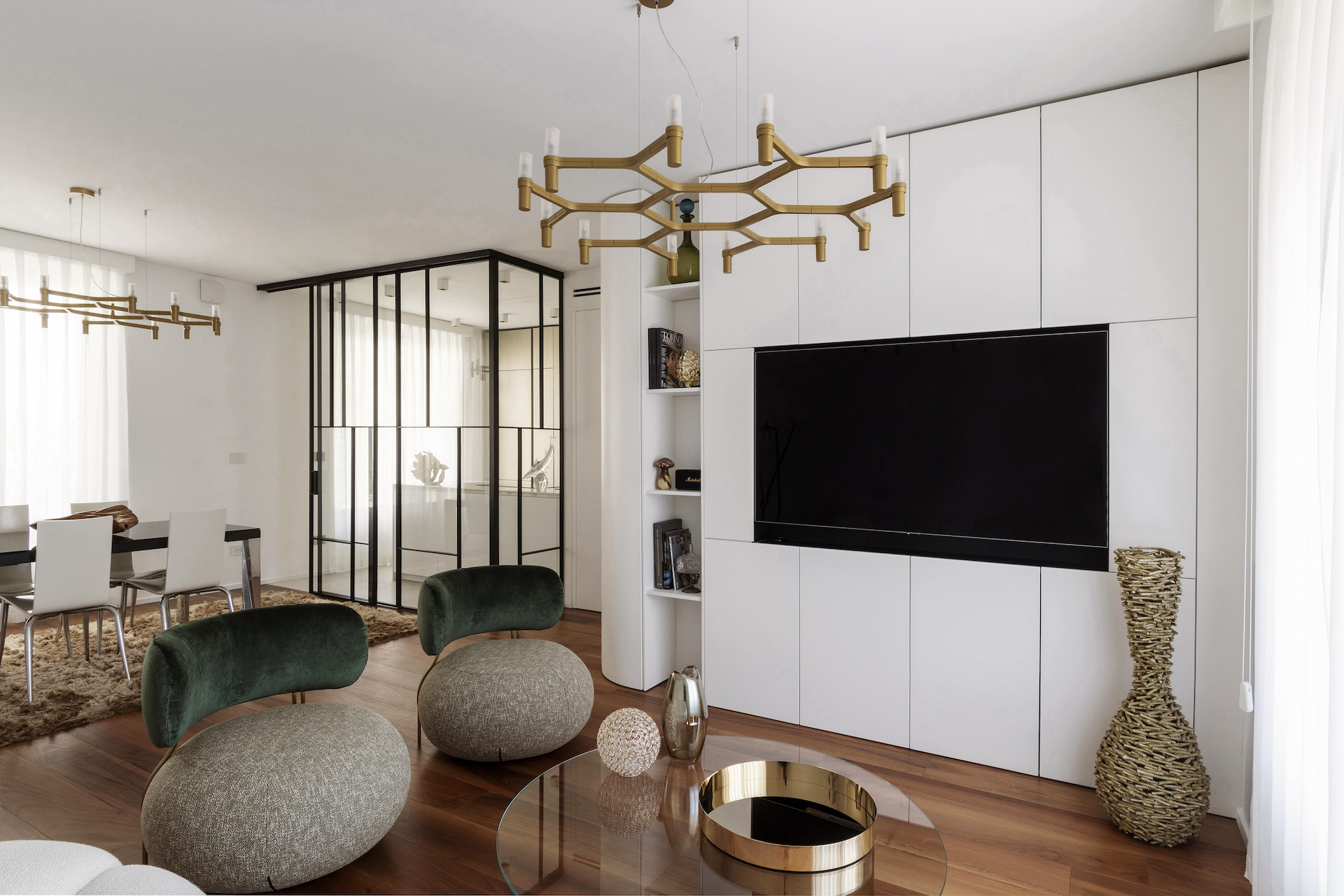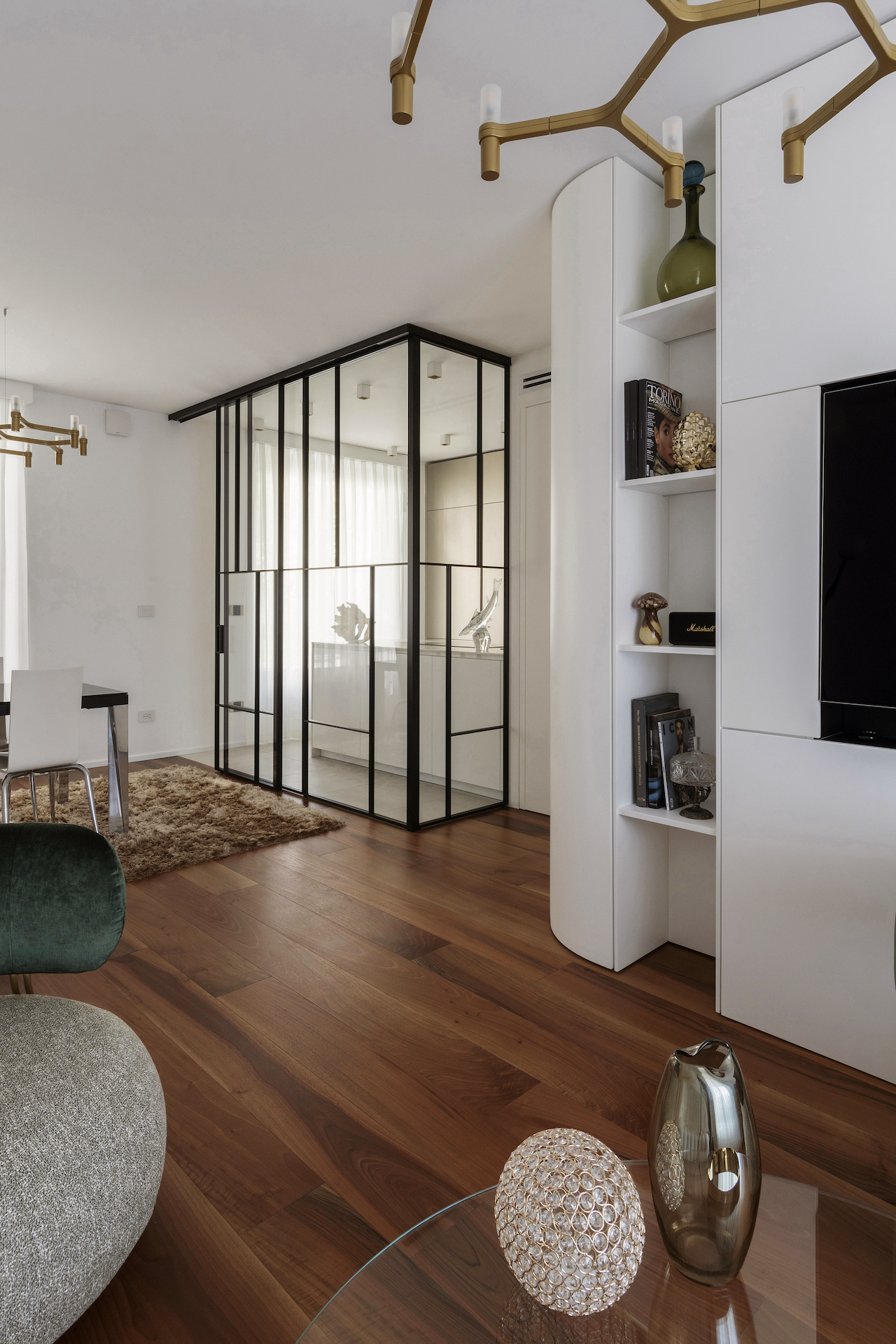 The focal point of the project is the living area, where the kitchen stands out as a separate space yet remains visually connected thanks to a floor-to-ceiling glass wall with black frames, resembling a domestic greenhouse. This system enables functions to be separated while containing odours and noises, without interrupting the perception of spaciousness and continuity. The glass wall becomes a decorative element, reflecting light and enhancing the continuous Italian walnut parquet flooring.