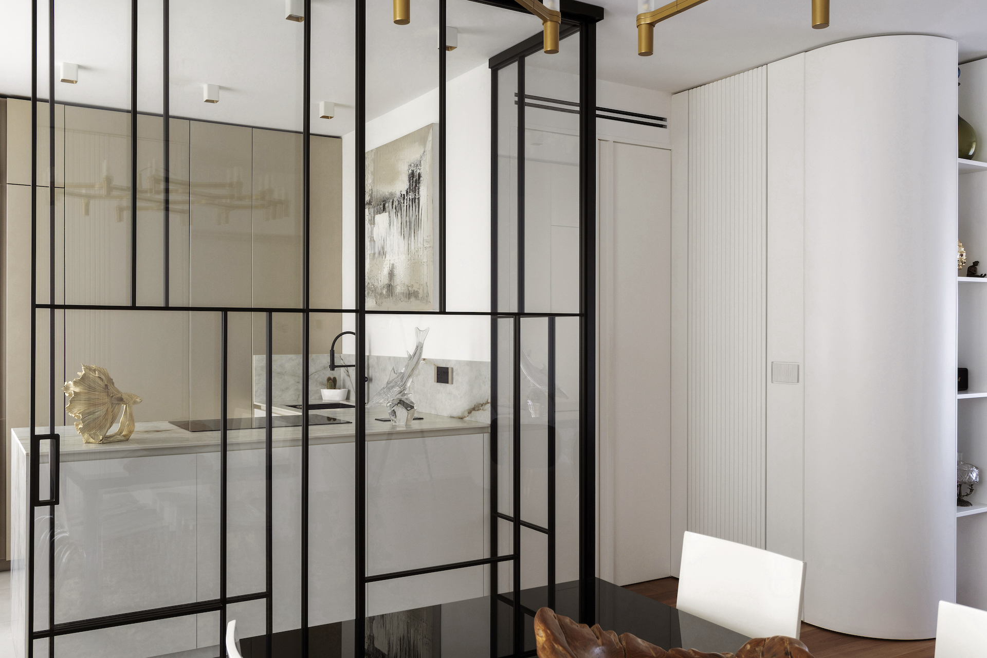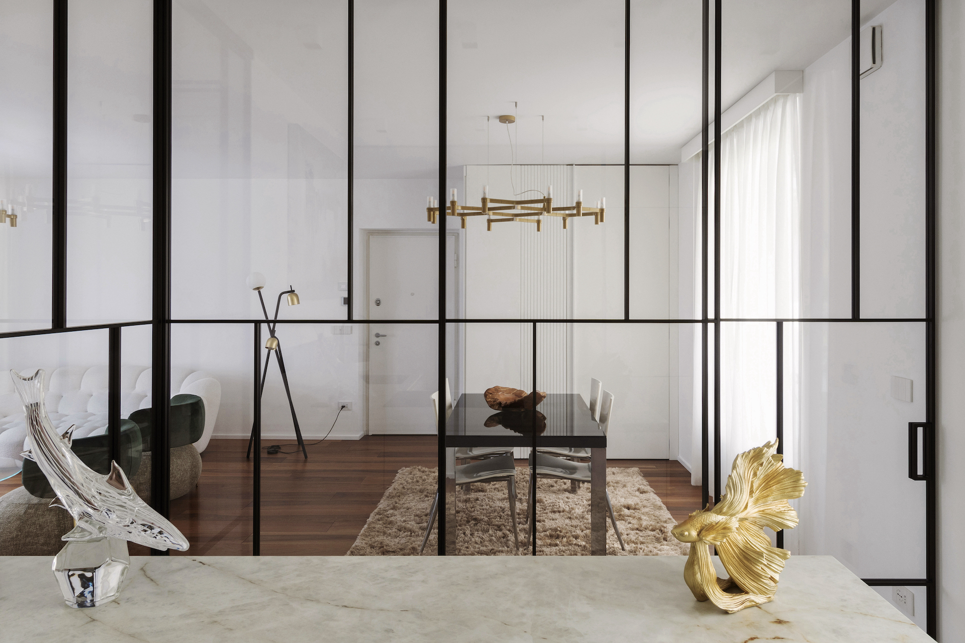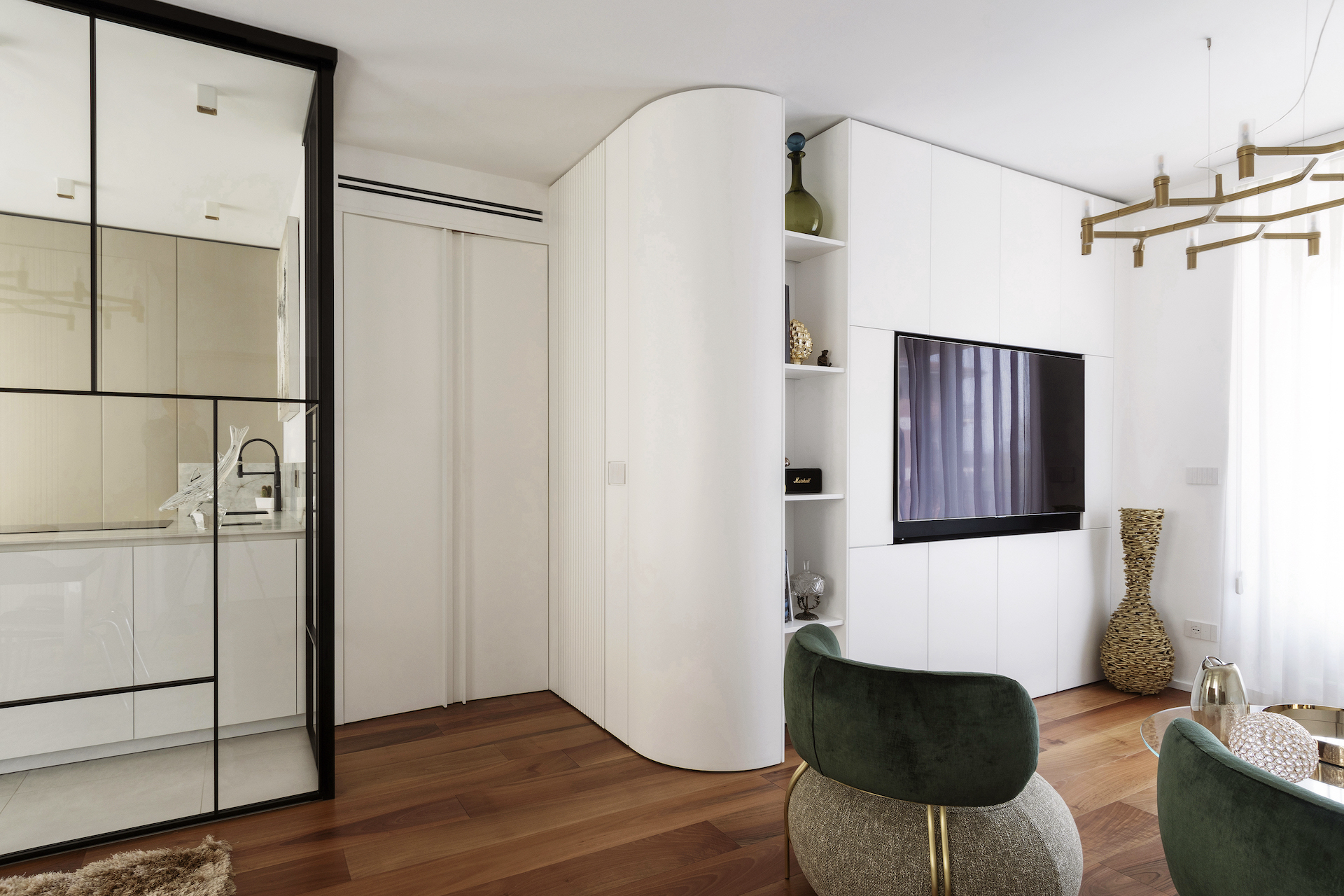 The focal point of the project is the living area, where the kitchen stands out as a separate space yet remains visually connected thanks to a floor-to-ceiling glass wall with black frames, resembling a domestic greenhouse. This system enables functions to be separated while containing odours and noises, without interrupting the perception of spaciousness and continuity. The glass wall becomes a decorative element, reflecting light and enhancing the continuous Italian walnut parquet flooring.