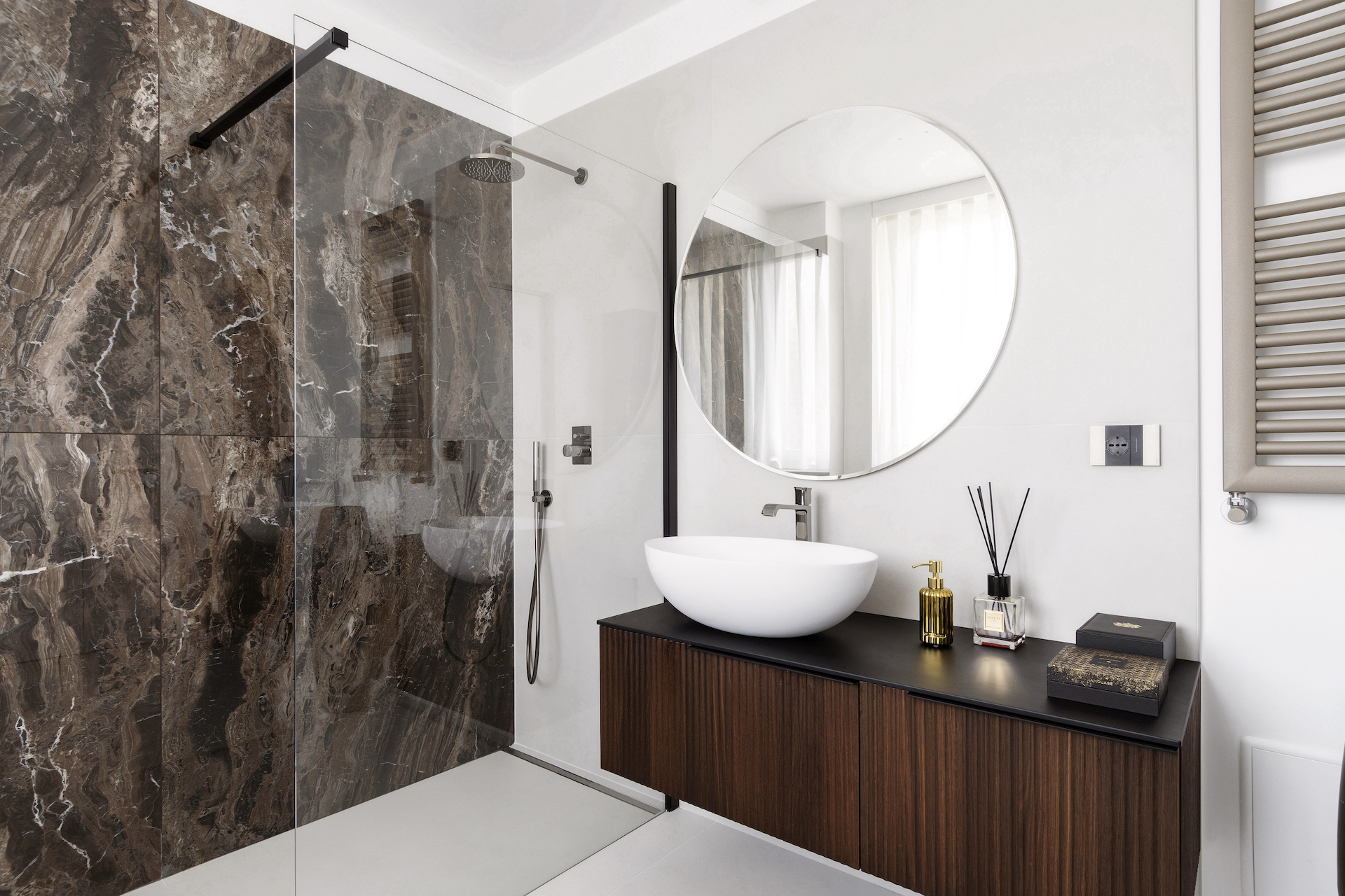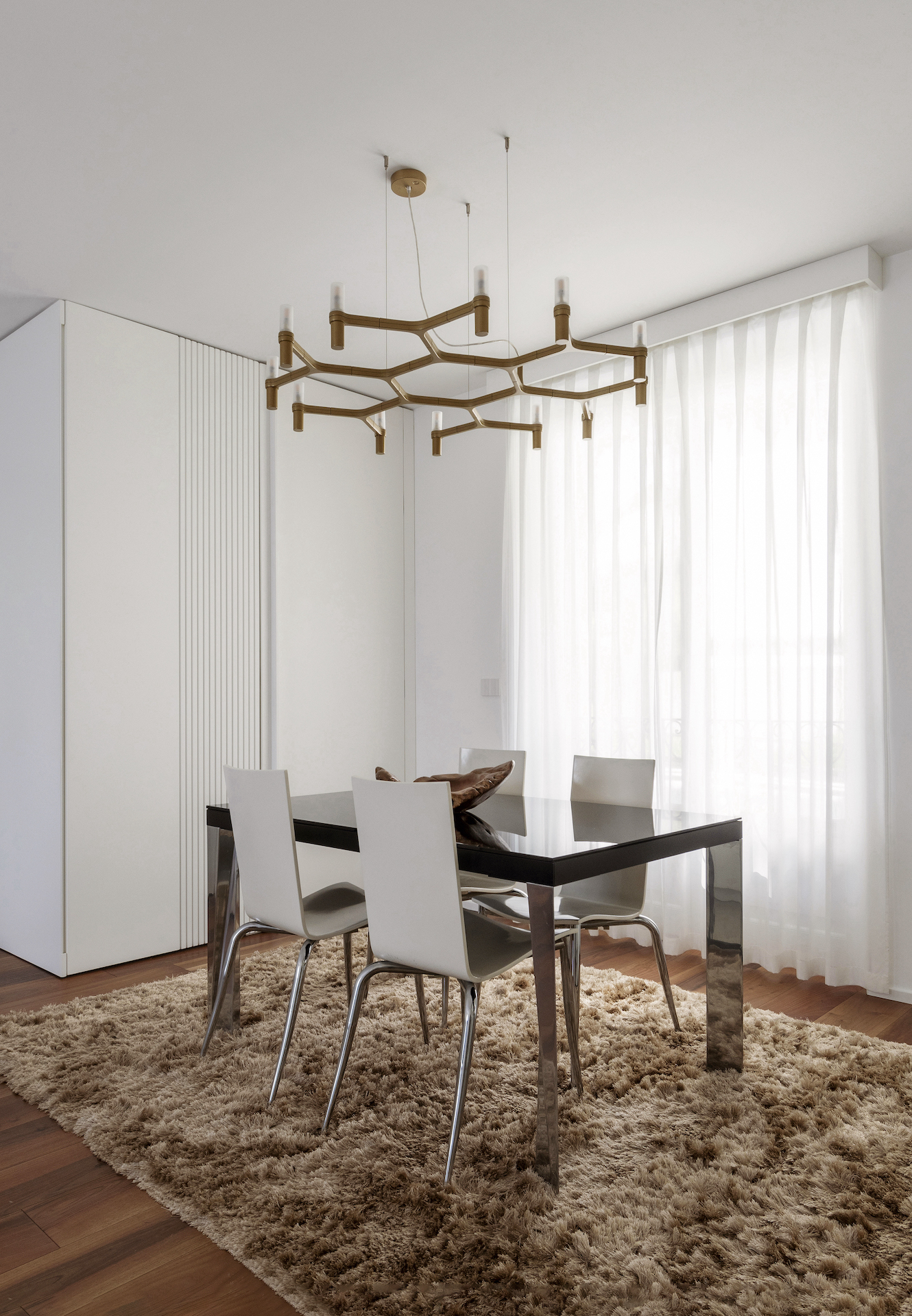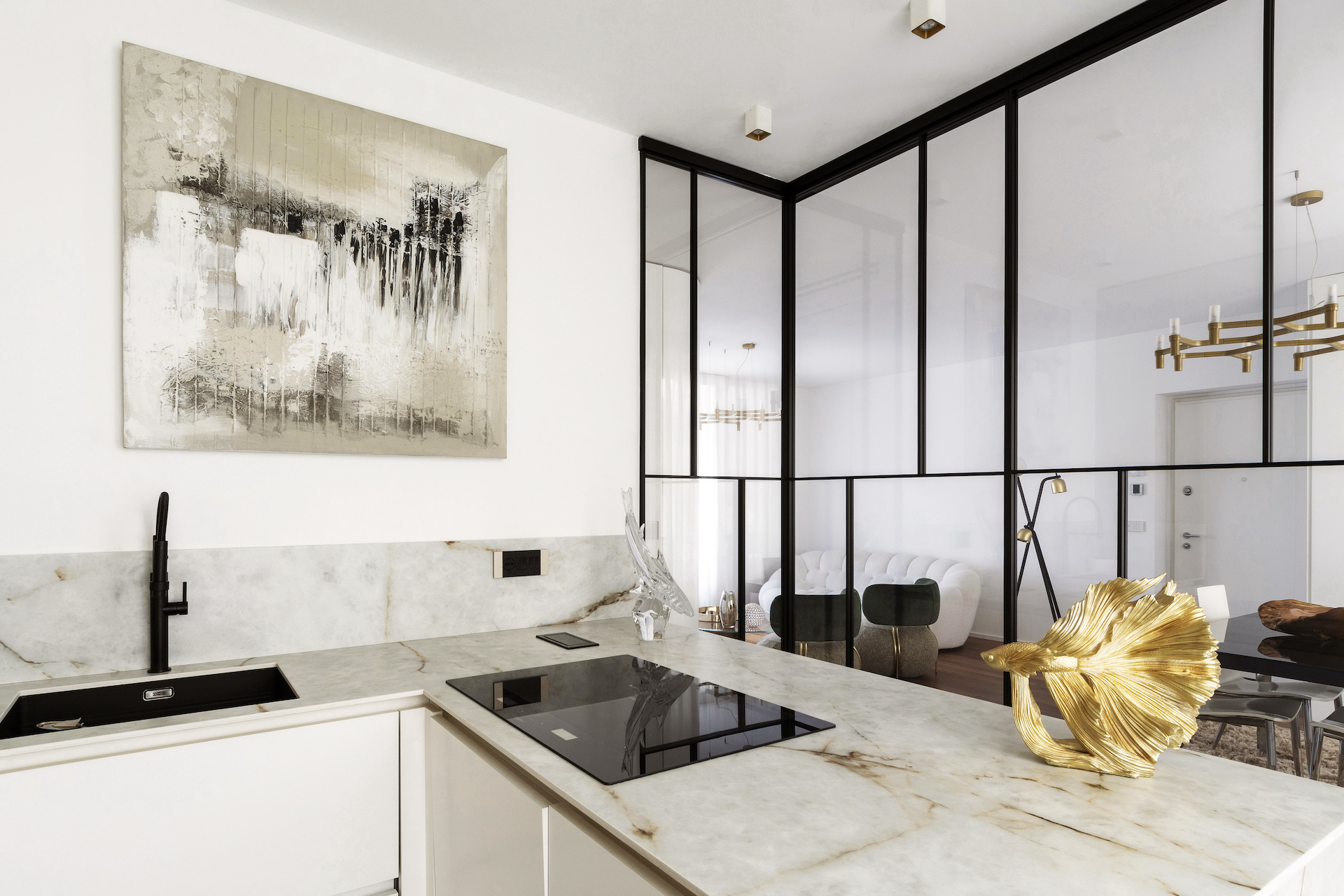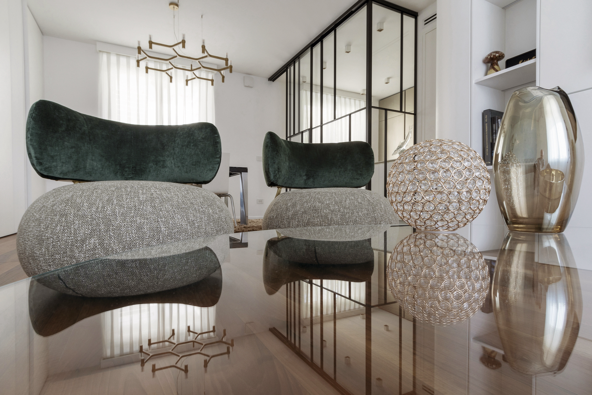 The focal point of the project is the living area, where the kitchen stands out as a separate space yet remains visually connected thanks to a floor-to-ceiling glass wall with black frames, resembling a domestic greenhouse. This system enables functions to be separated while containing odours and noises, without interrupting the perception of spaciousness and continuity. The glass wall becomes a decorative element, reflecting light and enhancing the continuous Italian walnut parquet flooring.