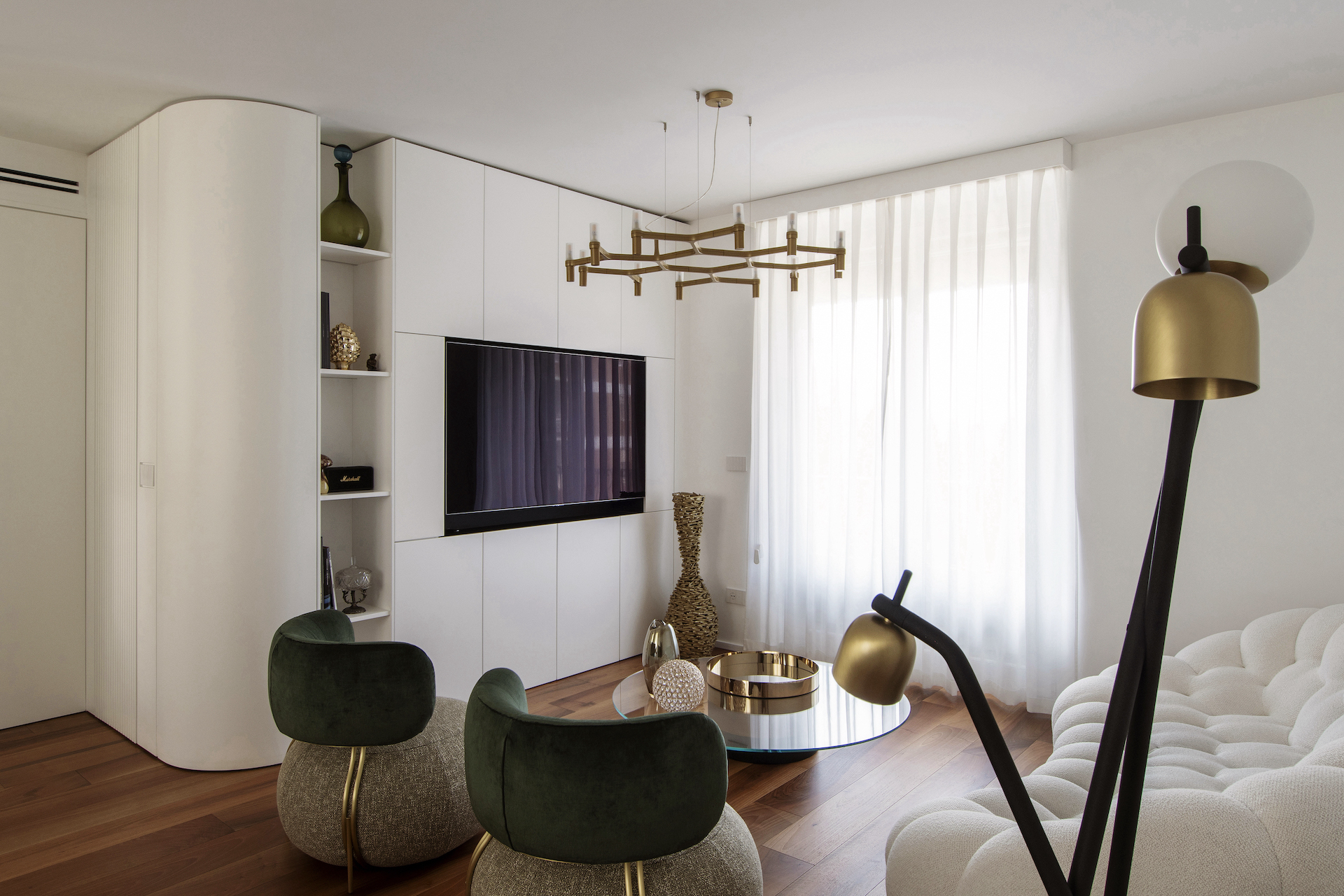 In the living room, the boiserie takes centre stage again with an even more elaborate design. Here, the white surface curves gently at the corner to integrate a concealed door that leads to the sleeping area. This formal gesture softens the volume, transforming it into an integral part of the space. This continuous cabinetry serves as a door, a TV cabinet, hallway panelling and single and double doors, forming a complex and refined system designed with artisan care down to the last centimetre. The pure white powder coating contrasts elegantly with the Italian walnut flooring.