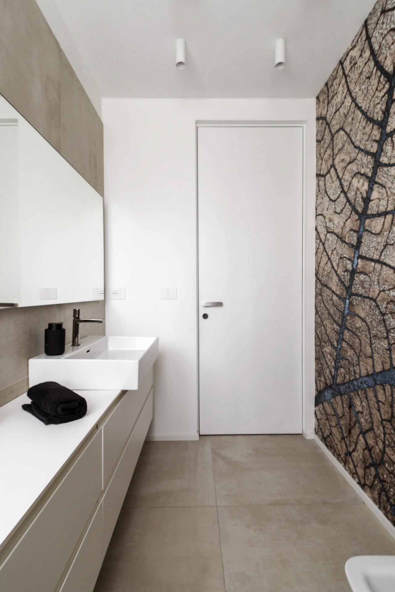 The guest bathroom is clean and rational in its geometry and embellished with a large mirror that multiplies the light and reflects the wallpaper along the main wall, making it the room’s true protagonist.
