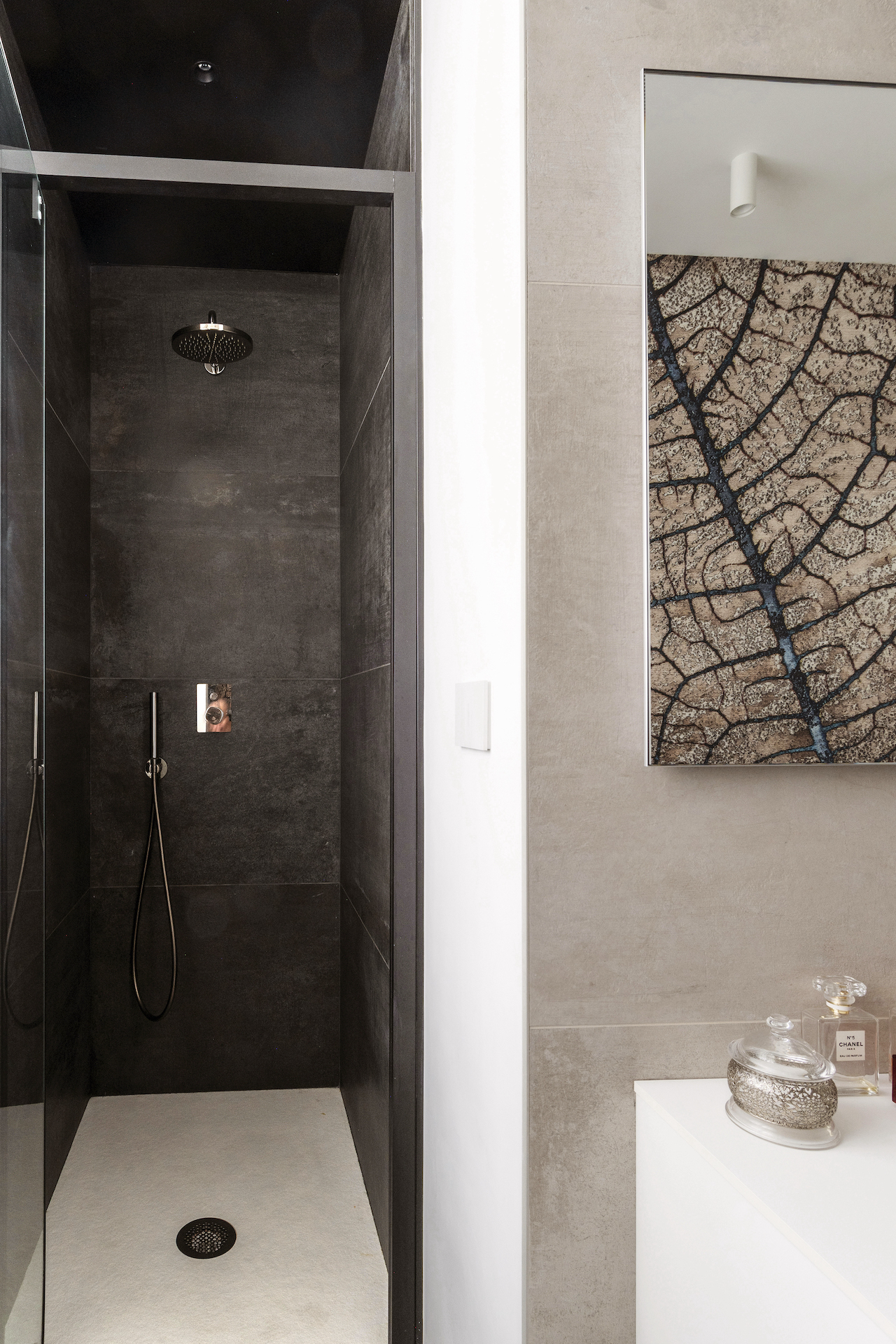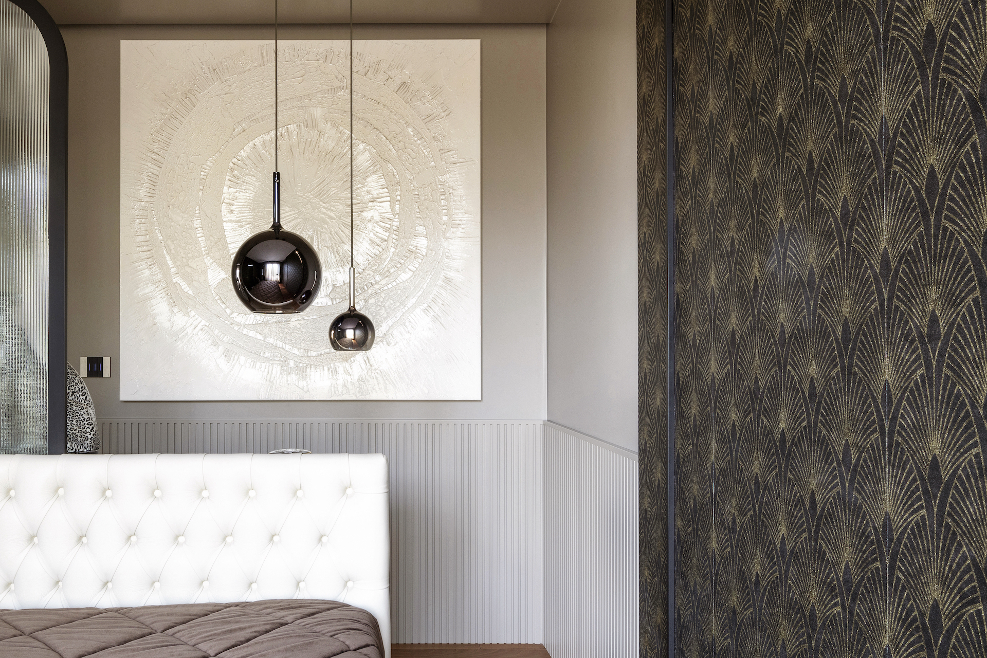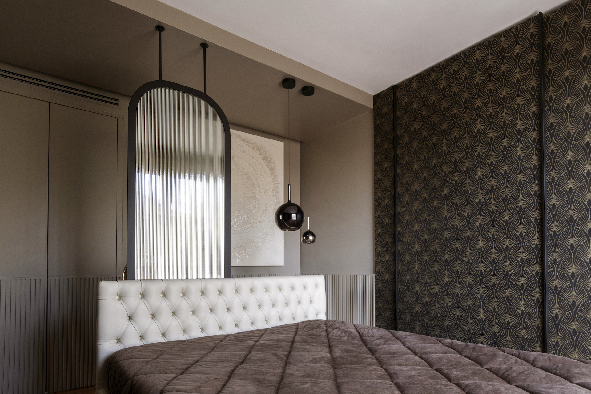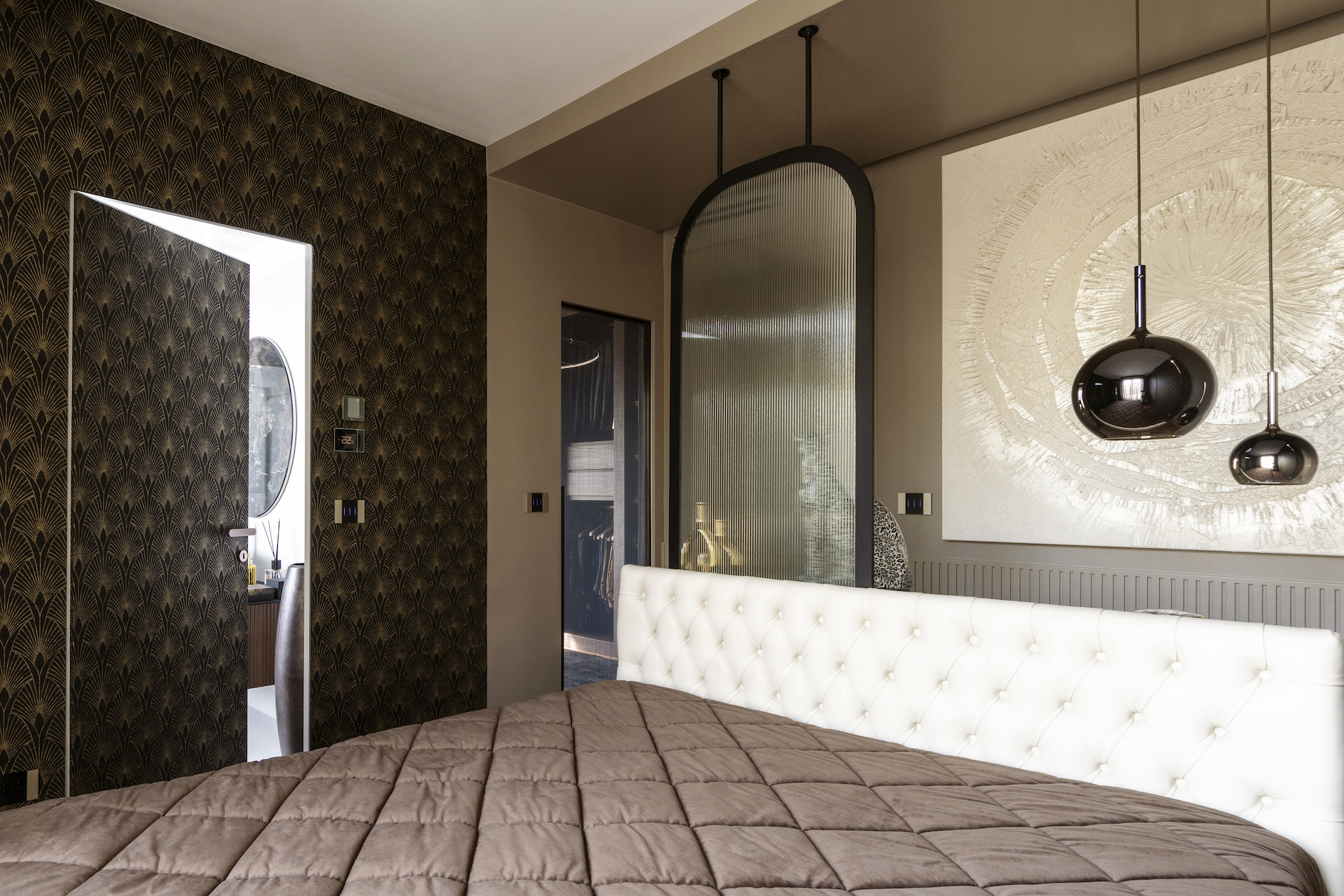The padded leather headboard and metal suspension contribute to the overall ambience, while the vertical panelling and Art Deco wallpaper create depth and character. The flush doors for the bathroom and walk-in wardrobe are integrated into the design and are almost invisible so as not to interrupt the visual continuity. The master bathroom features a large shower and custom-made furnishings that are in harmony with the bedroom’s aesthetics.