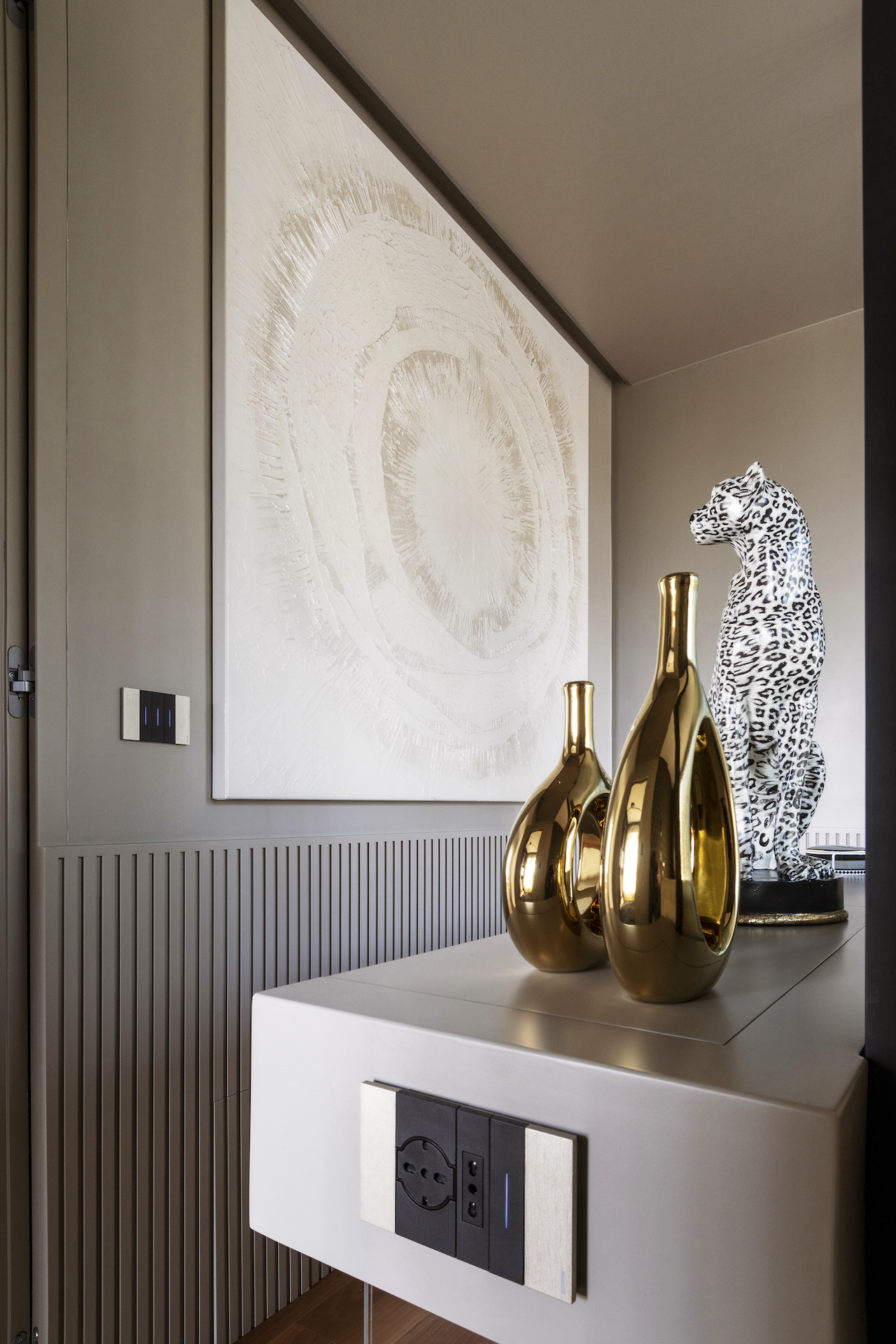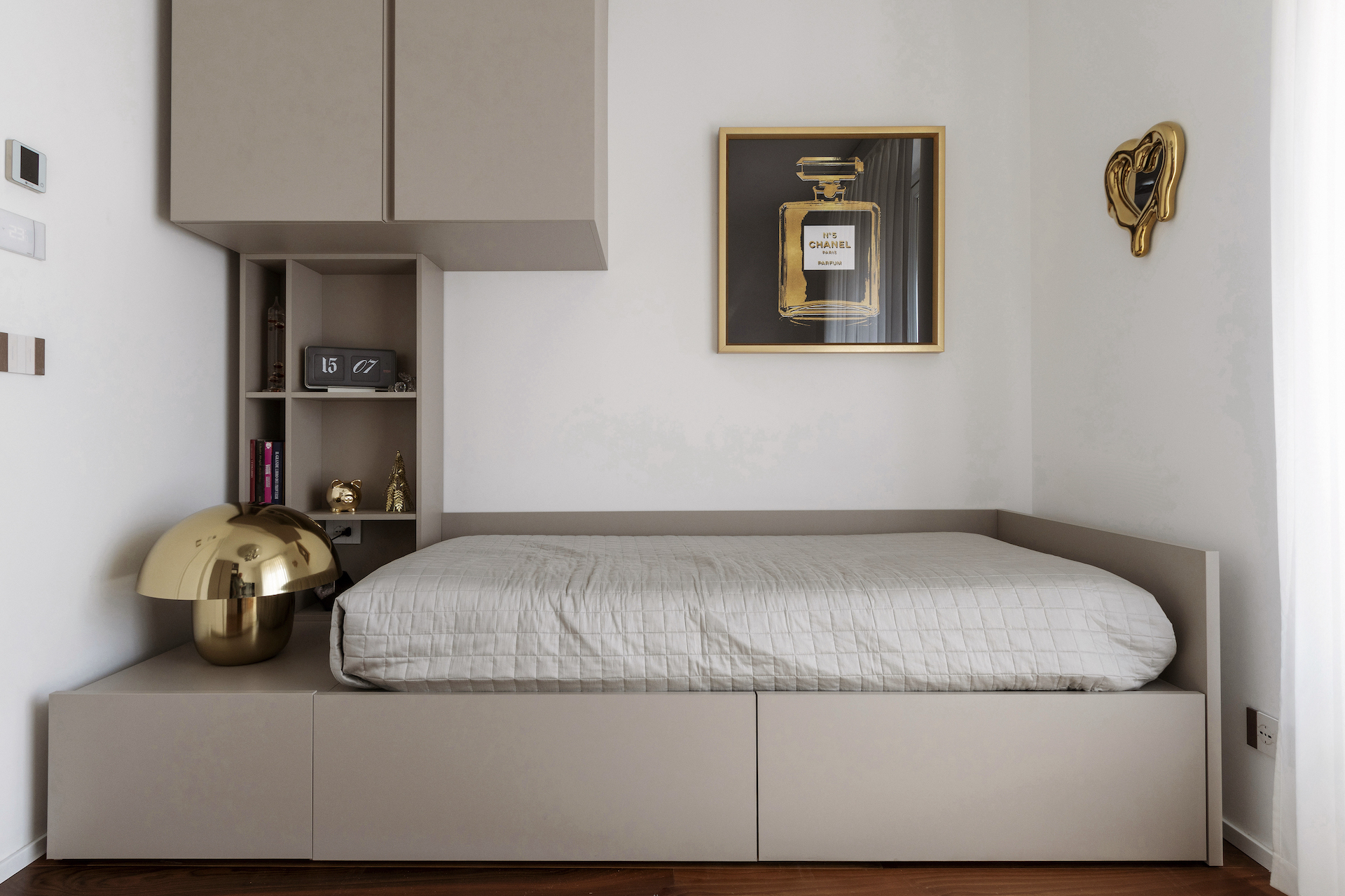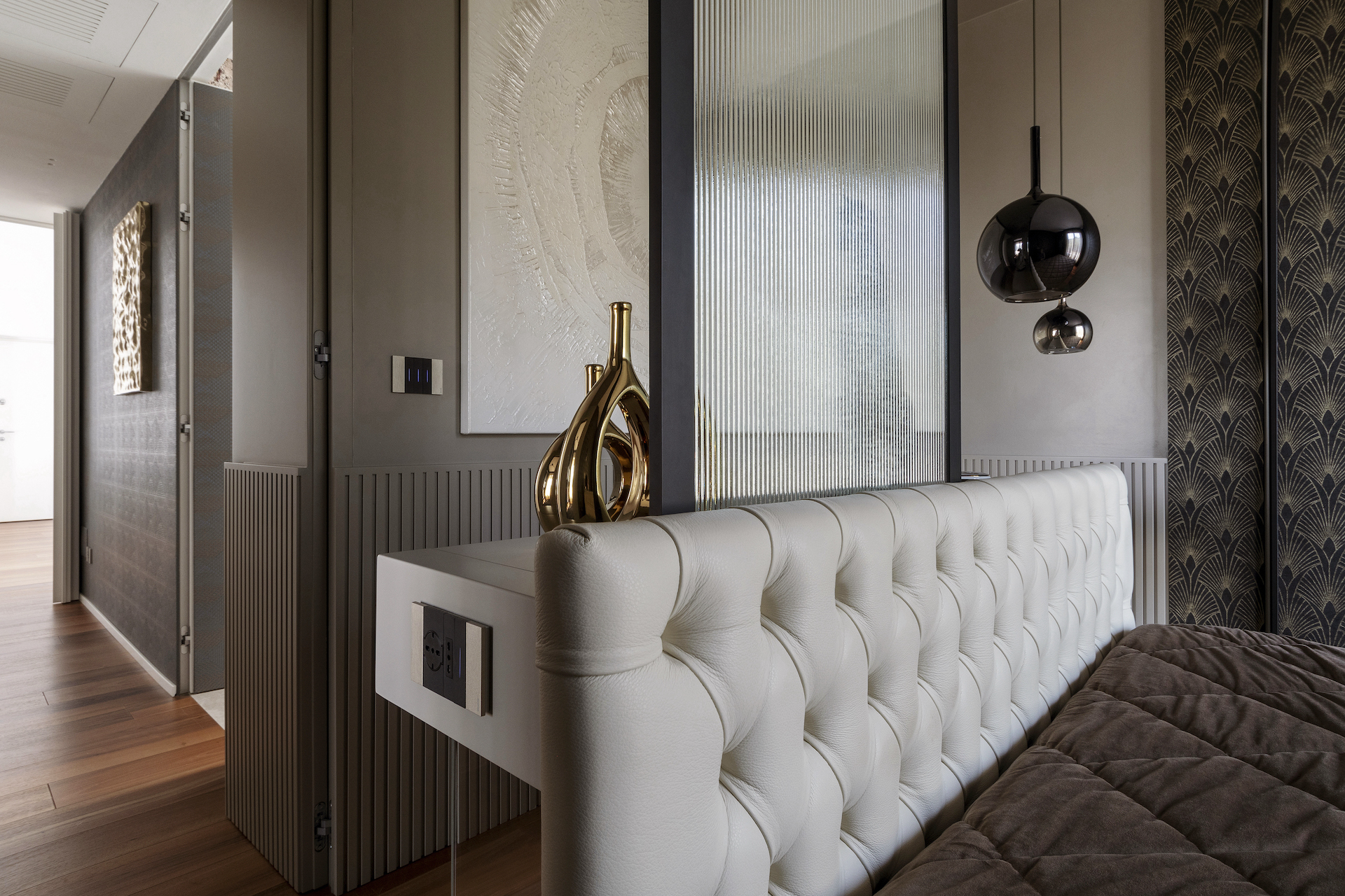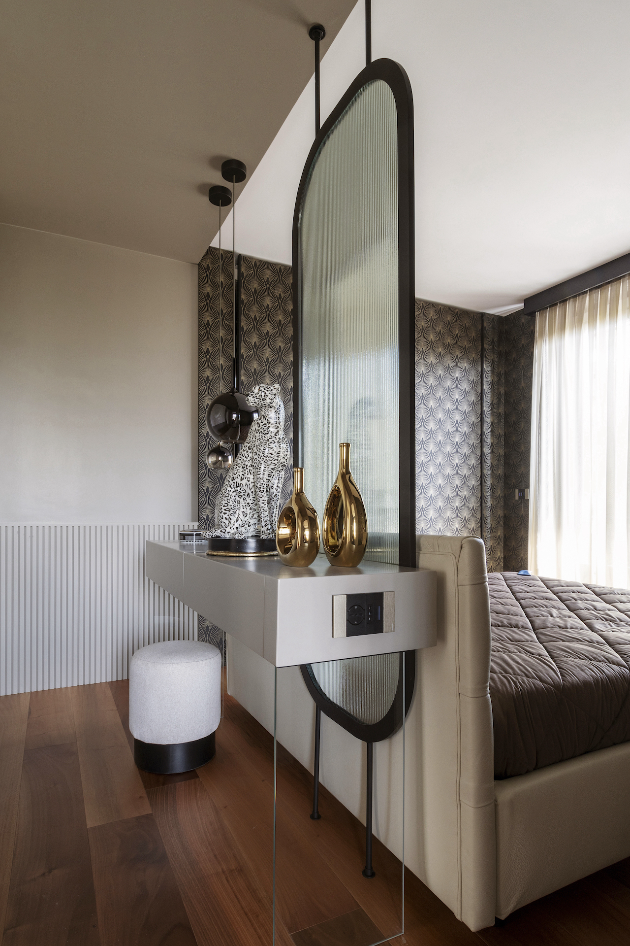 At the heart of the suite is an island-style dressing table, positioned behind the bed to create a scenic backdrop. This custom-made piece of furniture serves two purposes: it is both a bedside table and a work/beauty counter, making the most of the available space. The construction of this piece required ingenious solutions, such as a glass partition with a black frame that not only frames the area, but also allows for the passage of sockets and service lights, which could not be installed on the floor.