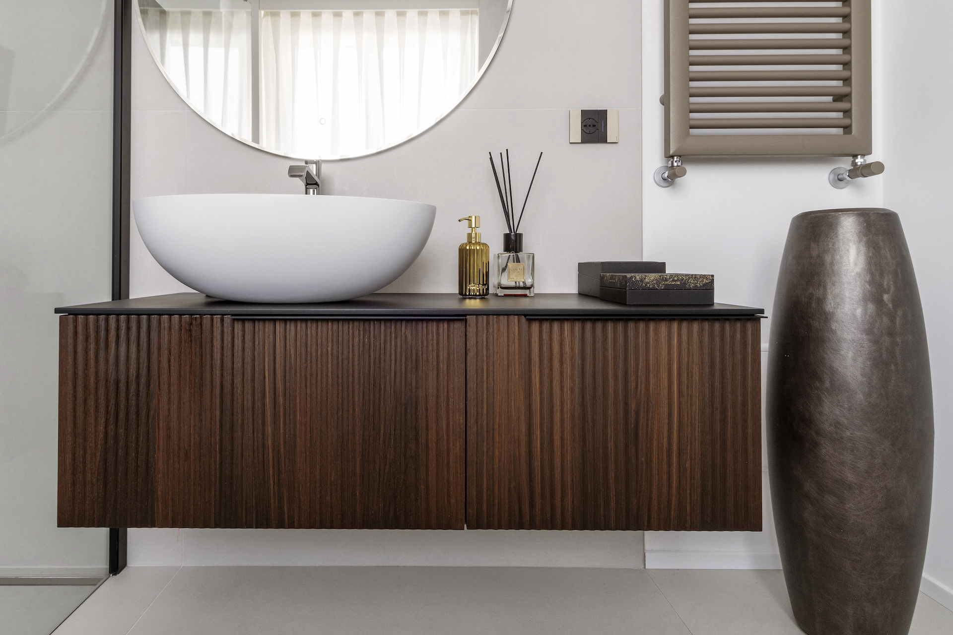 “We worked on a site that was already well advanced, enhancing the existing systems and trying to transform constraints into design opportunities,” explains Maurizio Pol. “The glass kitchen, curved boiserie and makeup area in the suite are the synthesis of this challenge: functionality, aesthetics and craftsmanship.”