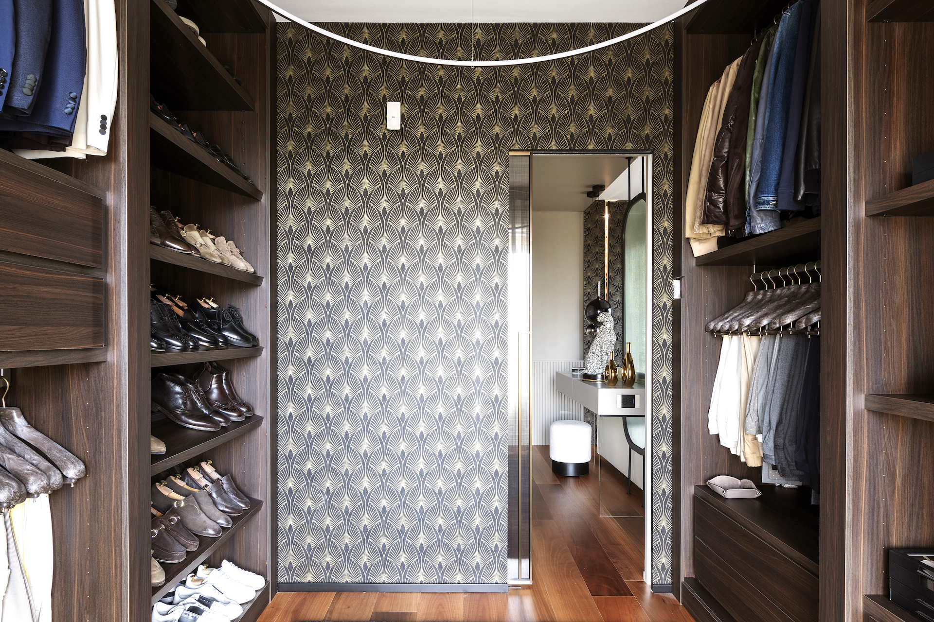 The hallway leading to the sleeping area is a true testament to craftsmanship. The boiserie runs along the entire right-hand wall, alternating between integrated doors, accessible compartments and purely decorative elements to create an orderly yet dynamic rhythm. On the opposite wall, geometric wallpaper adds personality and liveliness to the space with its fresh, youthful character.